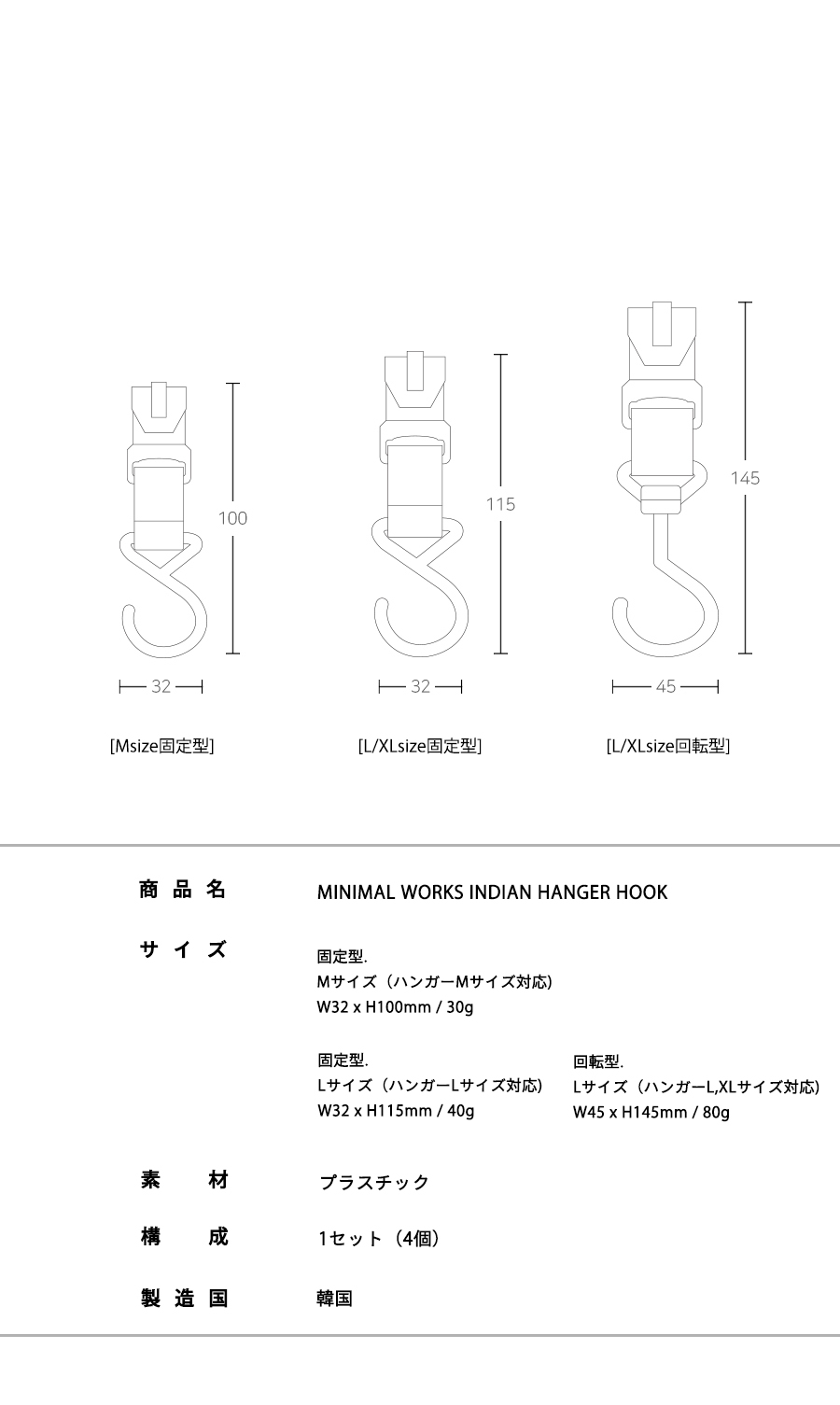 インディアンハンガーフックは固定型と回転型、2種類の4個1セットです。