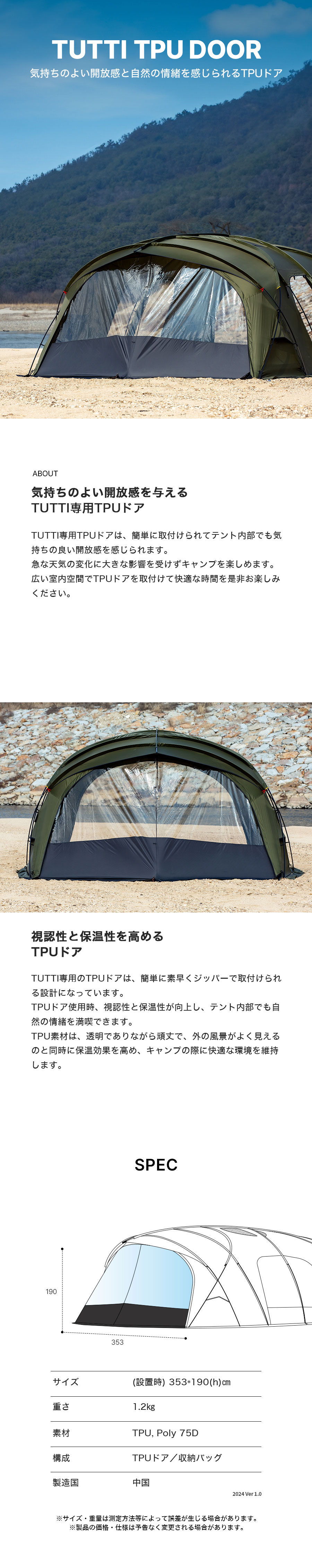 TUTTI専用TPUドアは、簡単に取付けられてテント内部でも気持ちの良い開放感を感じられます。 急な天気の変化に大きな影響を受けずキャンプを楽しめます。広い室内空間でTPUドアを取付けて快適な時間を是非お楽しみください。