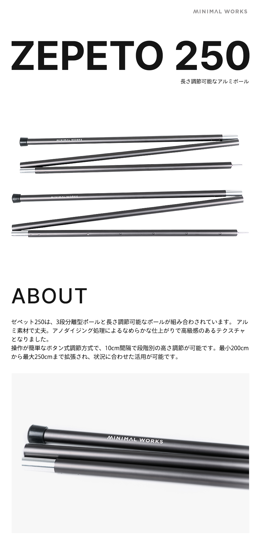 ミニマルワークのゼペット250は3段分離型ポールと長さの調節が可能な可変式ポールが結合したポールです。