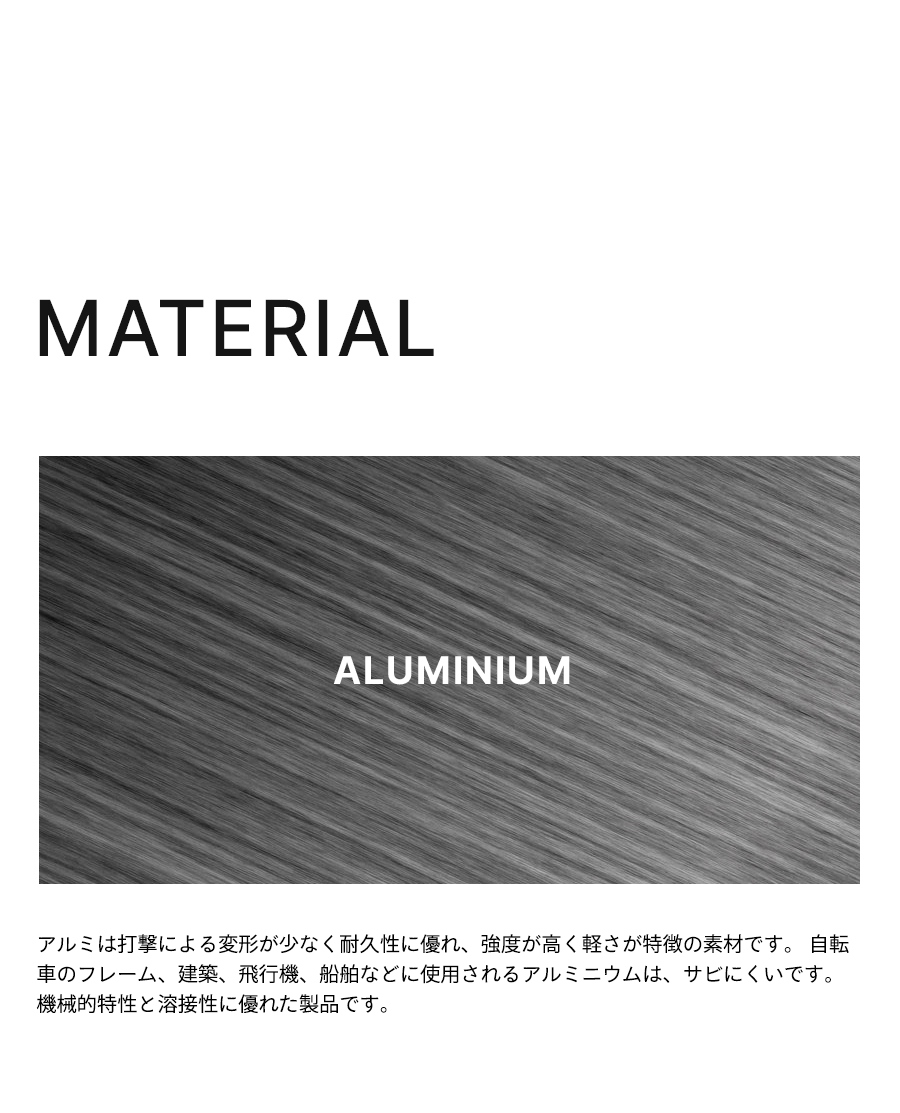 アルミニウム素材なので丈夫で腐食に強く、酸化などから表面を守るためにアノダイズ処理をしました。