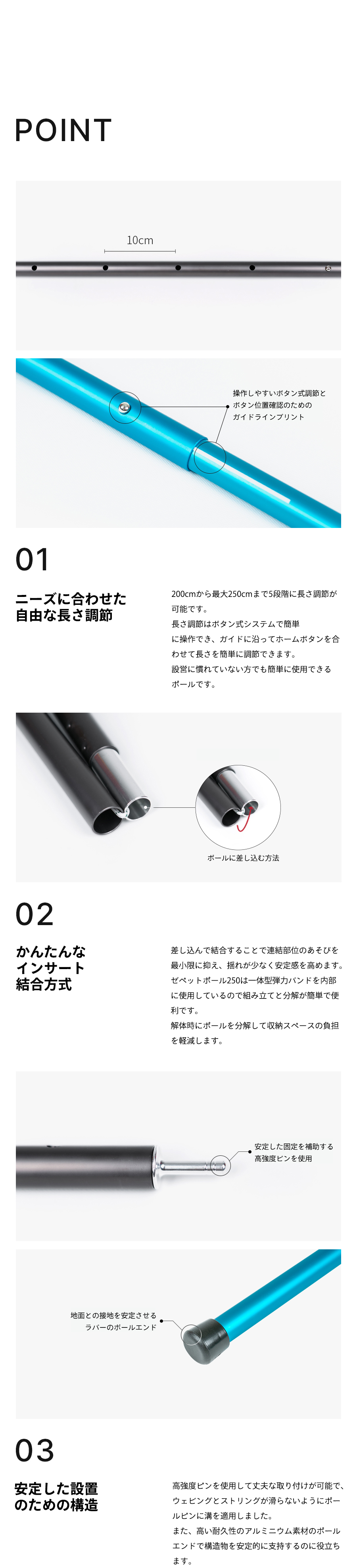 ボタン式の部分は10cm間隔で長さの調節が可能なので、最小200cmから最大250cmまで、使用環境に合わせて活用が出来ます。