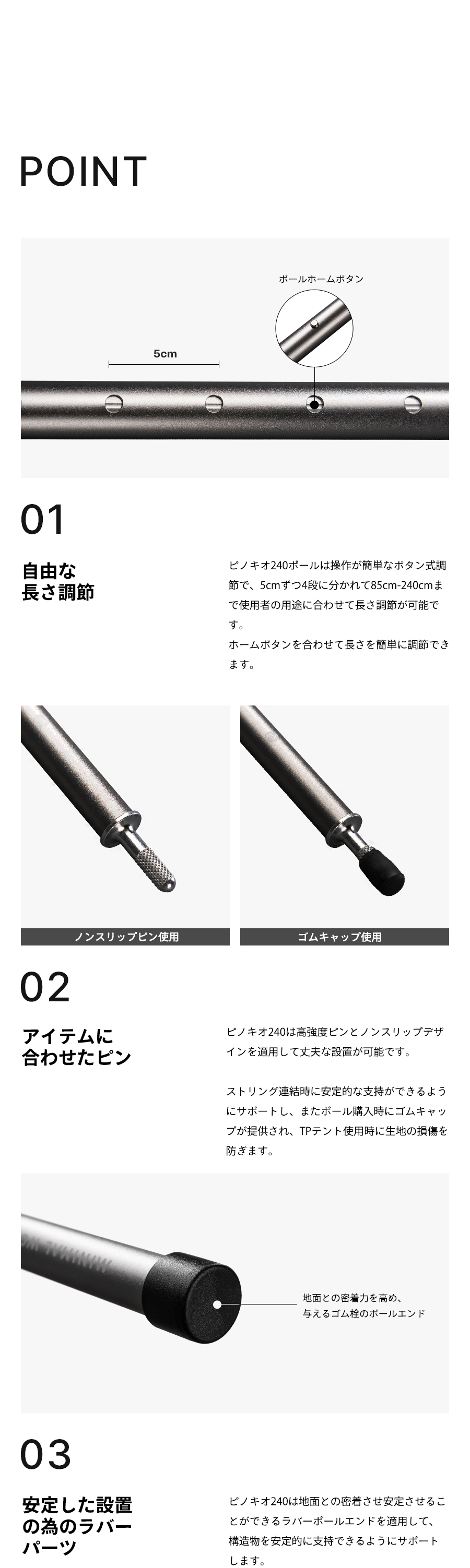 ミニマルワークスのピノキオ240ポールは、5cm間隔で調節が可能な可変式ポールです。
