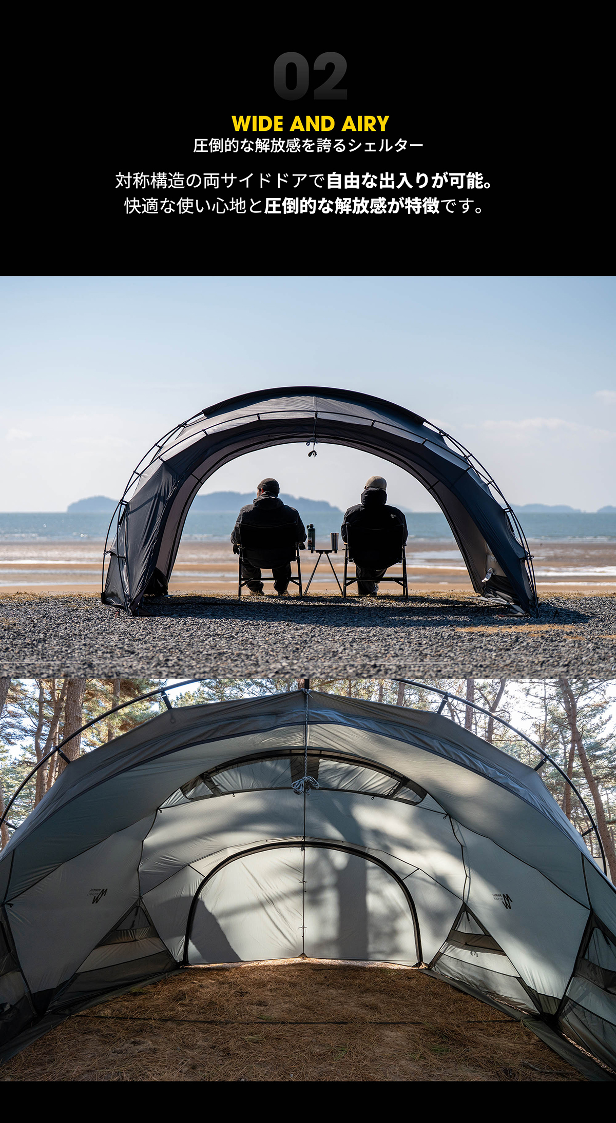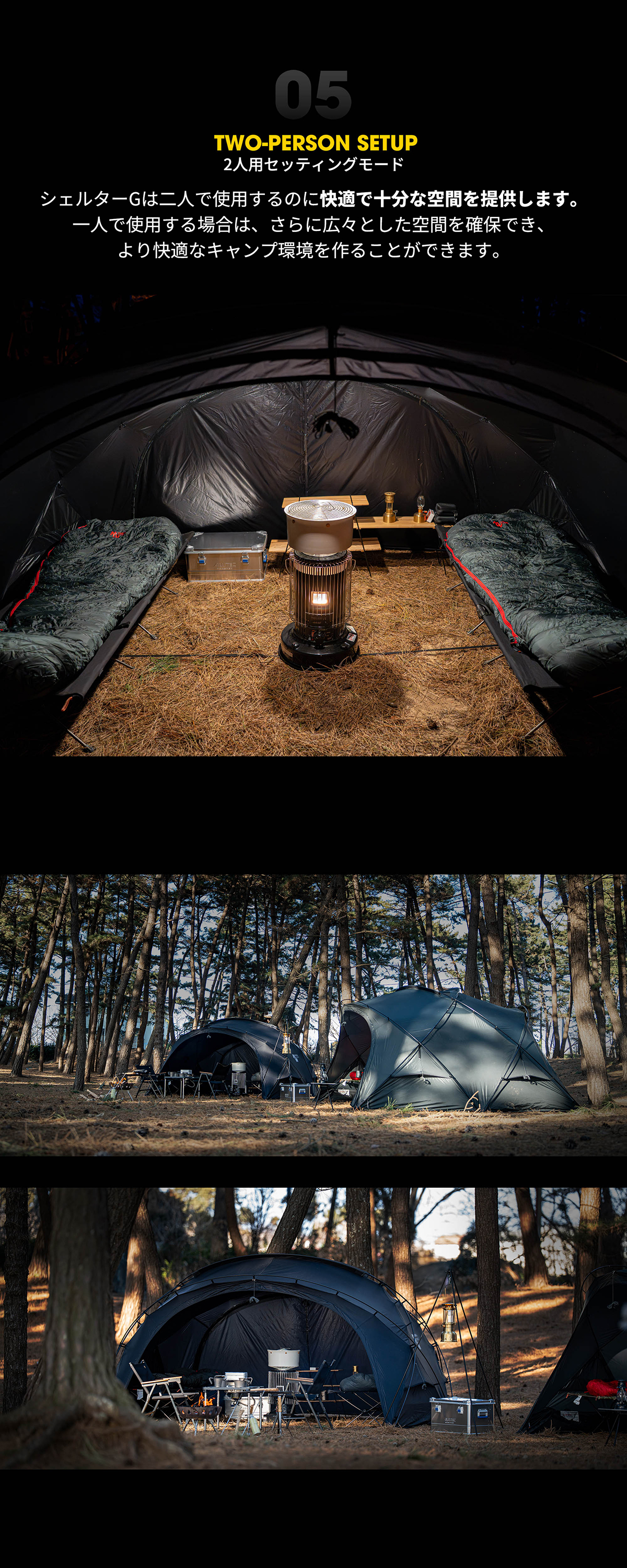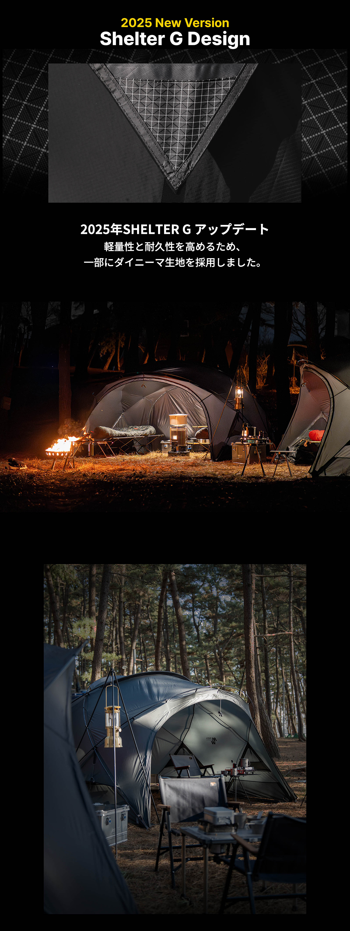 MINIMALWORKSのシグネチャーテントであるグアバ4Pインナーテントを再解釈したSHELTER Gは、ダブルクロスポール仕様で空間と解放感に卓越しています。 2025年バージョンは、一部にダイニーマ生地を採用し軽量性と耐久性を高めました。