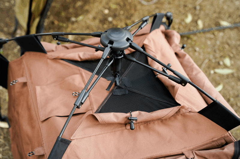 折り畳み傘に例えられるポール式の構造が特徴的です。実際の使い方も傘に似通っていることもあり、一般的なテントのようにポールを組んでいく必要はありません。