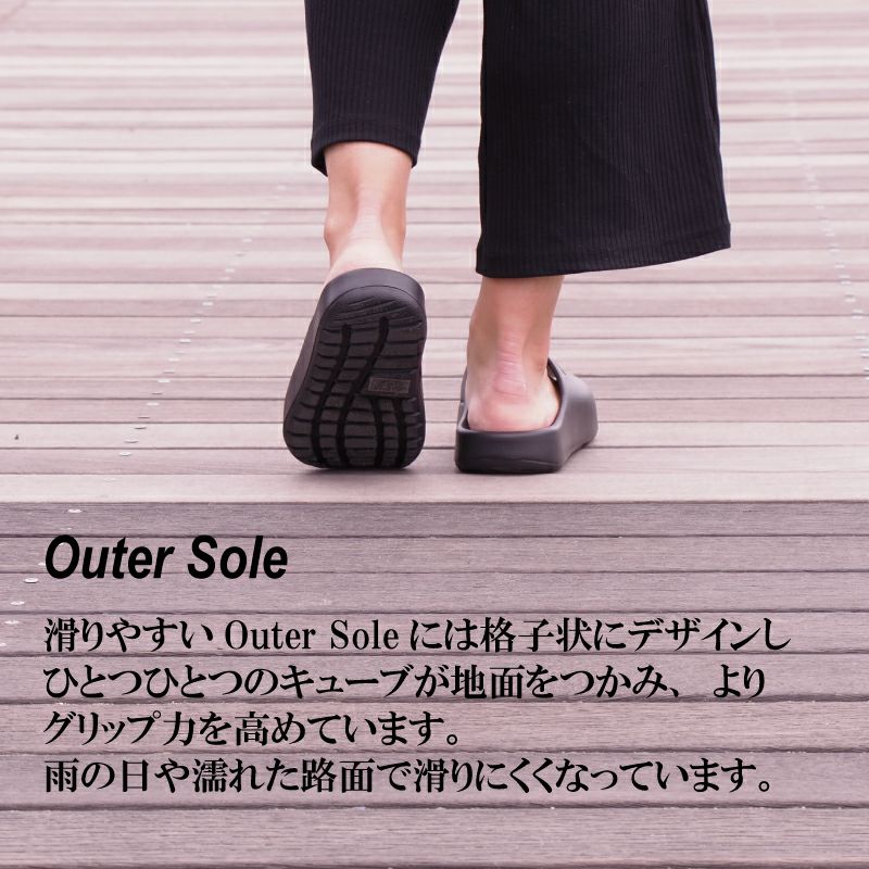 アウトソールは細かい溝が接地面をしっかりとグリップしてくれるので、床やサンダルが濡れていてもスリップしにくい仕様です。