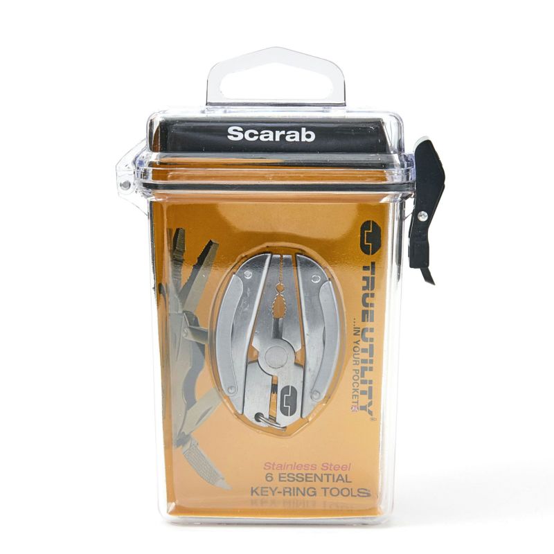 全7機能(のこぎり、ラジオペンチとワイヤーストリッパー、プラスドライバー、ナイフ、ヤスリ、マイナスドライバー、キーチェーン【取り外し可能】)のミニプライヤーツールです。 スカラベ(コガネムシ)のようにコンパクトに畳めます。