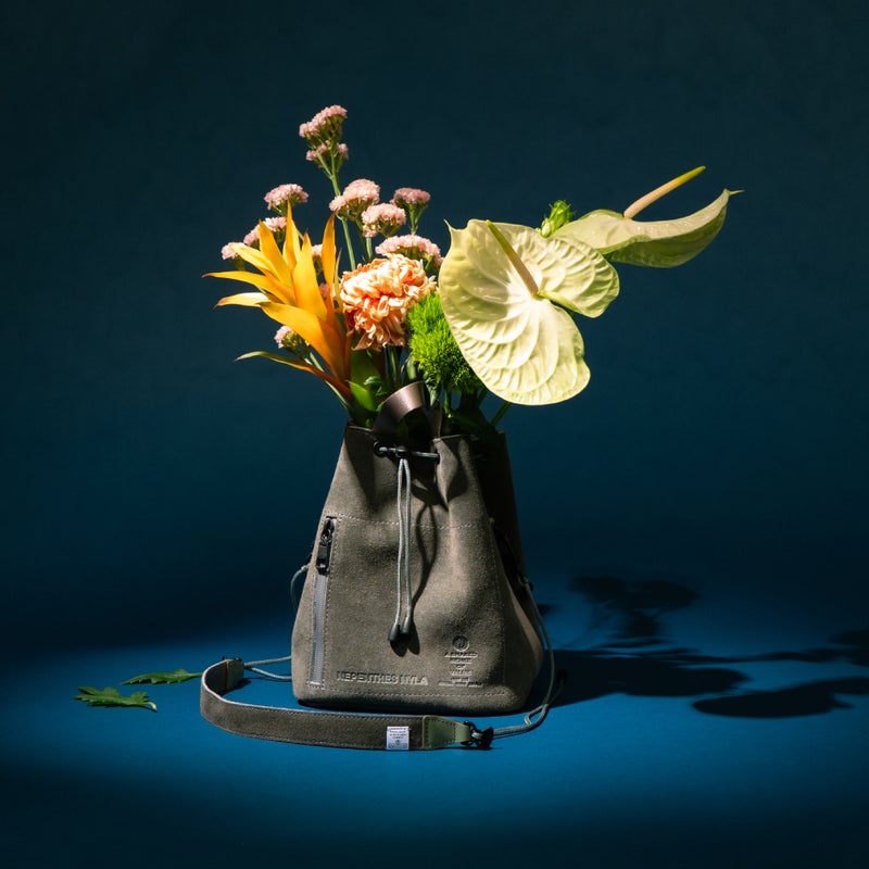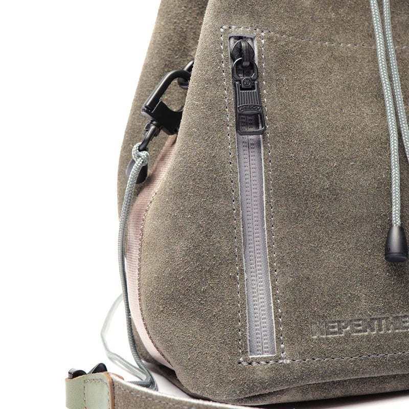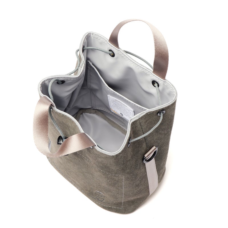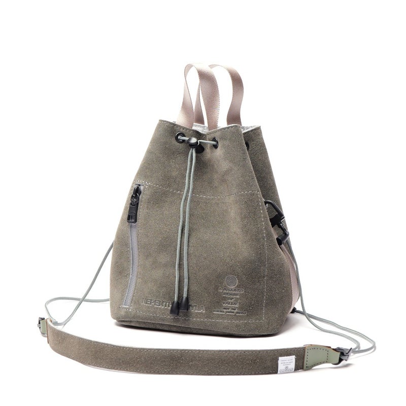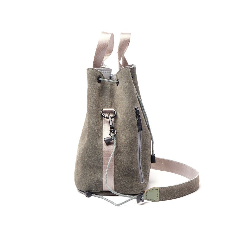 AS2OVのユニセックスでも使える人気シリーズDRAWSTRING BAGの防水スエードモデル。500mlのペットボトルまで入るオリジナルモデルと新しく展開するminiでお選びいただけます。下の画像はminiモデルです。