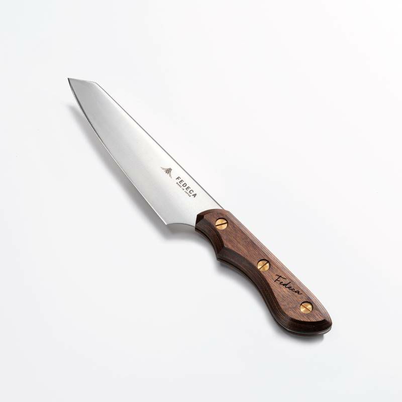 折畳式料理ナイフをお使いのアウトドアラバーな皆様から もう少し刃渡りの長いものも欲しい! という声を多く頂いておりました。 特に料理にこだわりある皆様にとっては普段使いできる包丁を、 スタイリッシュに持ち出すことができたら嬉しいですよね。 そんな皆様にご提案したいのが、FEDECA「三徳包丁」。 スタイリッシュに持ち運ぶことを軸に置いたプロ仕様の家外共用の包丁です。 こだわりのポイント3つをご紹介します! 抜群の切れ味でメンテナンス性もGOOD!。 ブレードの鋼材には日本製の高機能ステンレスAUS8を採用。医療用のメスやナイフなどにも用いられ、錆などに強い耐蝕性をもつ非常に研ぎやすく、扱いやすい鋼材です。 お気に入りのトングやナイフとコーディネートを楽しめる。 ハンドルには水に強い積層強化木を採用。