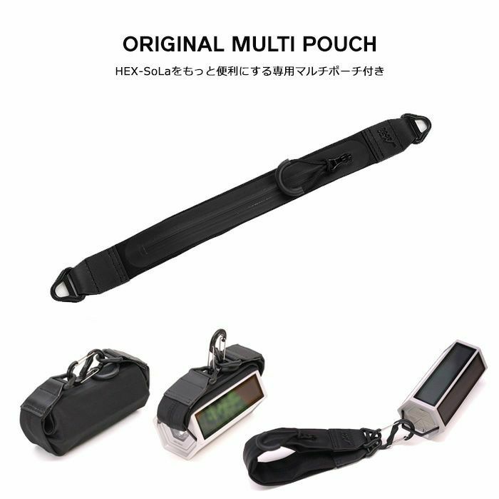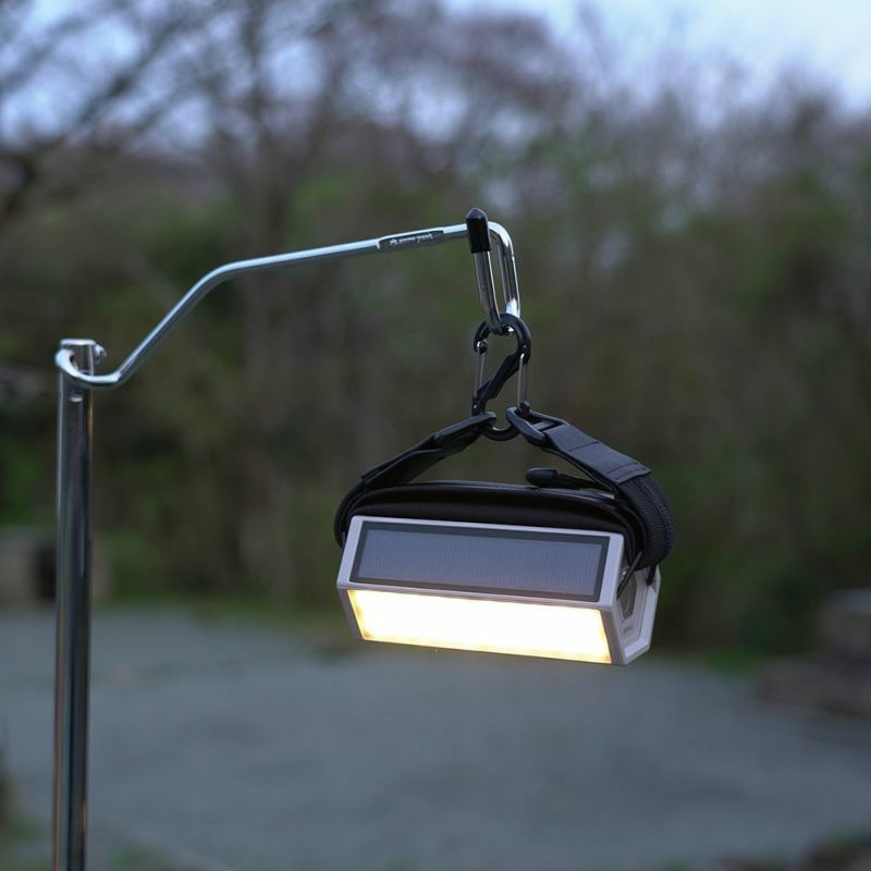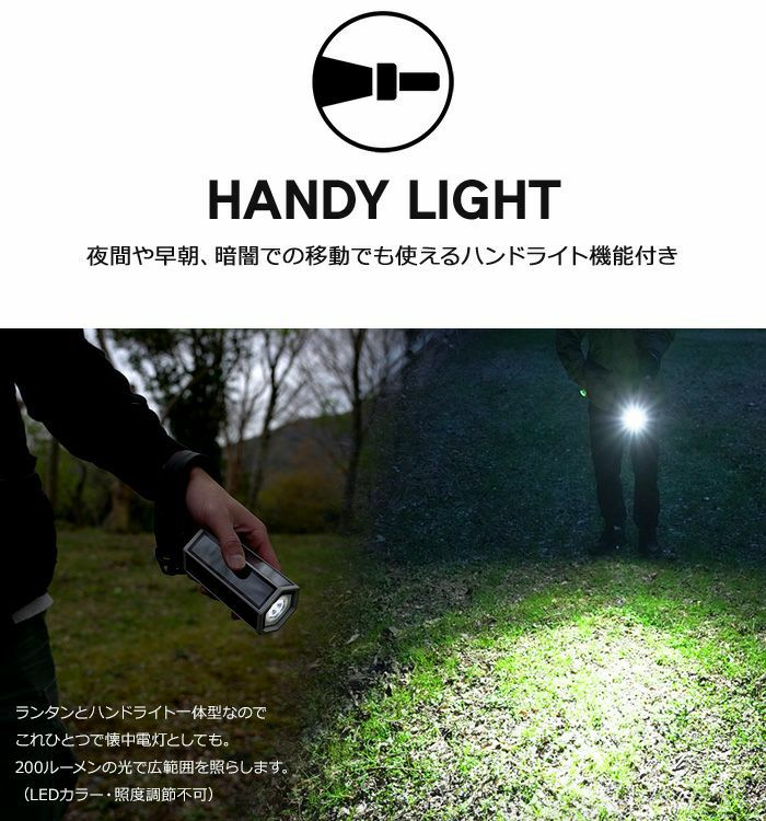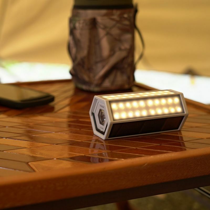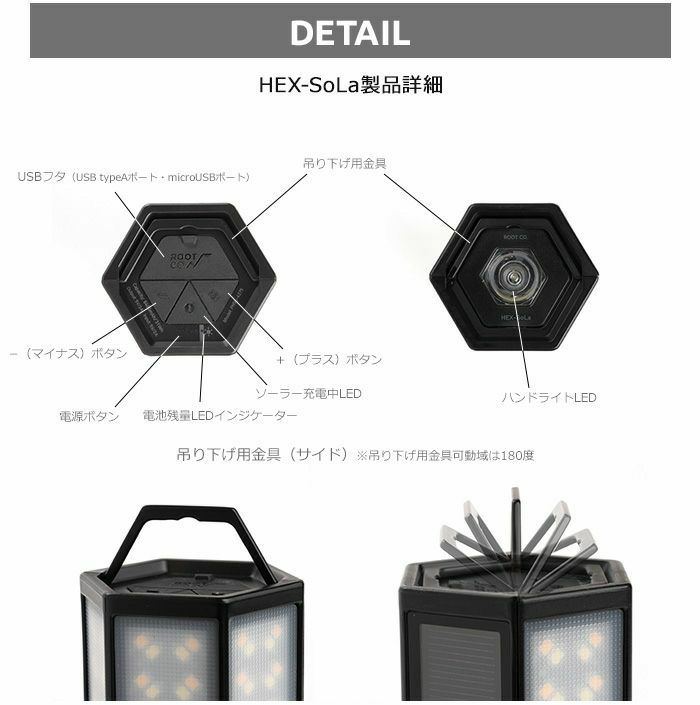 六角形の特徴を最大限発揮できるよう設計・デザインされた、ROOTCO.オリジナルのソーラー充電対応バッテリー機能付きLEDランタン『HEX-SoLa(へクス-ソラ)』。 3枚のソーラーパネルと3枚のLEDパネルを上下に、側面にはハンドライト用LED、各種USB入出力ポートと操作ボタン、吊り下げ用金具をそれぞれ配置しました。 吊るす・置く・引っ掛ける等の使い方ができ、各種アウトドアシーンに合わせて使用できるよう防塵防水機能も兼ね備えた、多機能LEDランタンです。 【LEDLANTERN】 120個のLEDチップを搭載し、最大1500LM(ルーメン)の明るさで出力が可能。 シーンに合わせて最適な明るさで照らせるよう、5段階の照度(明るさ)調整機能、3種類の色温度(カラー)切替機能を備えました。 照度:15・100・500・1000・1500(LM) 色温度:暖色・白色・混合色 【HANDYLIGHT】 照度(明るさ)200LMのハンドライト(懐中電灯)機能も搭載。 暗闇での移動や、スポットで灯りを照らしたいシーンでもご利用可能です。 ※ランタンとハンドライトを同時に点灯することはできません。 【SOLARCHARGE&USBCHARGE】 太陽光をソーラーパネルに当てることでHEX-SoLaへの充電が可能。 夏場の晴天時、約6時間のソーラー充電で最長約10時間点灯可能(最小照度点灯時)になります。 USB充電の場合は約7~8時間で満充電となります。 ※USB充電中は各機能(ランタン、ハンドライト、ソーラー充電、USB出力)は使用できません。 【MOBILECHARGER】 9300mAhの大容量で、HEX-SoLaから他のモバイル機器への充電が可能。 ※最大出力:5V/2A(充電する機器により異なります。) 【DUSTPROOF&WATERPROOF】 IP65の保護等級に準拠した防塵防水性能。 水没させない限りあらゆる場面において水の侵入を防ぎ、埃の侵入を防ぎます。 水辺でのアウトドアシーンはもちろん、急な雨などでも安心して使えます。 ※USBポート部分のキャップが閉まっている状態での保護等級です。キャップを閉めてご使用下さい。 【MULTIPOUCH】 伸縮性のある生地を使用した専用収納ポーチを付属。 HEX-SoLaの収納だけでなく、吊り下げ用金具に通しS字カラビナで固定することで、ランタンを下向きに照らす際に使用可能です。 ハンドライト使用時には、腕に通す落下防止用リストバンドとしても使うことができる、マルチポーチとなっています。 カラー:ブラック/グレー メーカー型番:PHSL-431623/PHSL-431630 付属品:マルチ収納ポーチ・カラビナ・USB-microUSBケーブル・取扱説明書 バッテリー容量:3.7V/9300mAh 入力:DC5V/2A 出力:5V/2A 本体充電時間:USB充電約7~8時間 保護等級:IP65 ランタン連続点灯可能時間:(ご使用時の環境により差が生じる場合がございます。) ・15LM:約416時間 ・100LM:約276時間 ・500LM:約85時間 ・1000LM:約45時間 ・1500LM:約7時間 ハンドライト連続点灯可能時間:(ご使用時の環境により差が生じる場合がございます。) ・200LM:約13時間