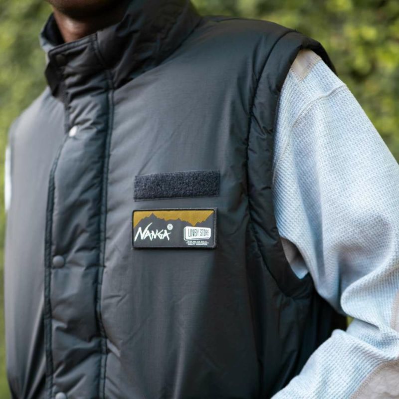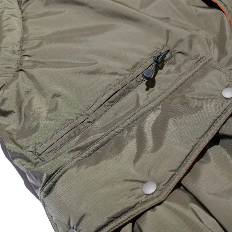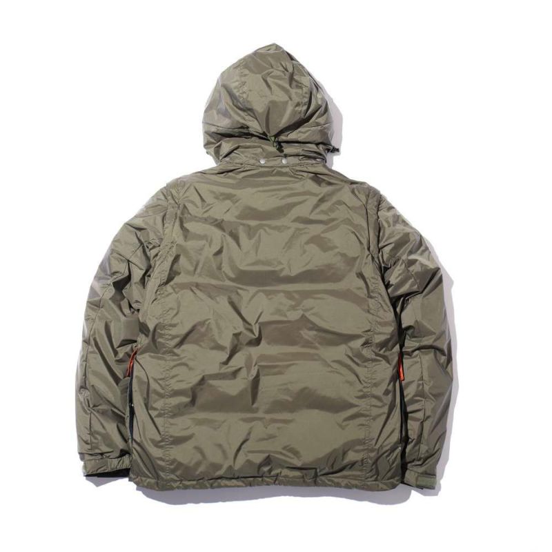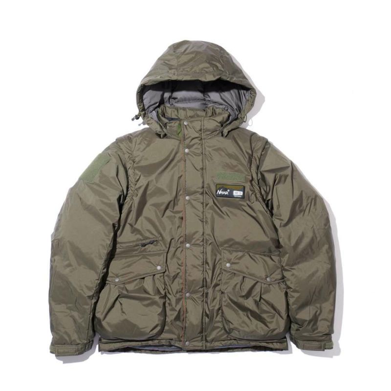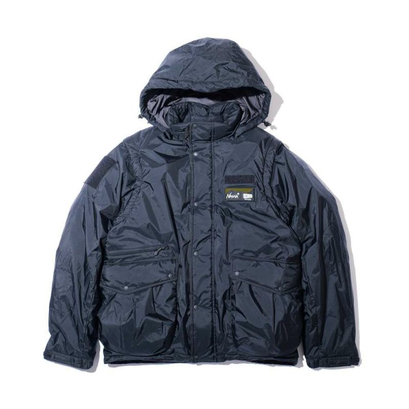 インラインの難燃素材のダウンをベストをベースに作られ、袖とフードは取り外しができるデタッチャブル仕様に。