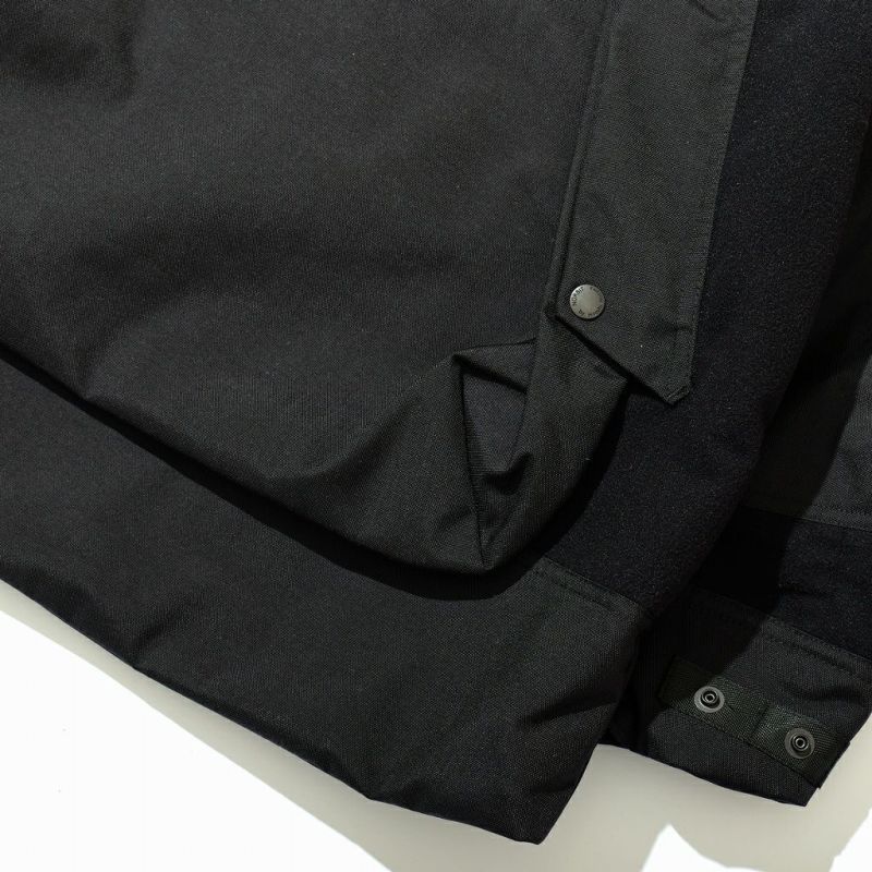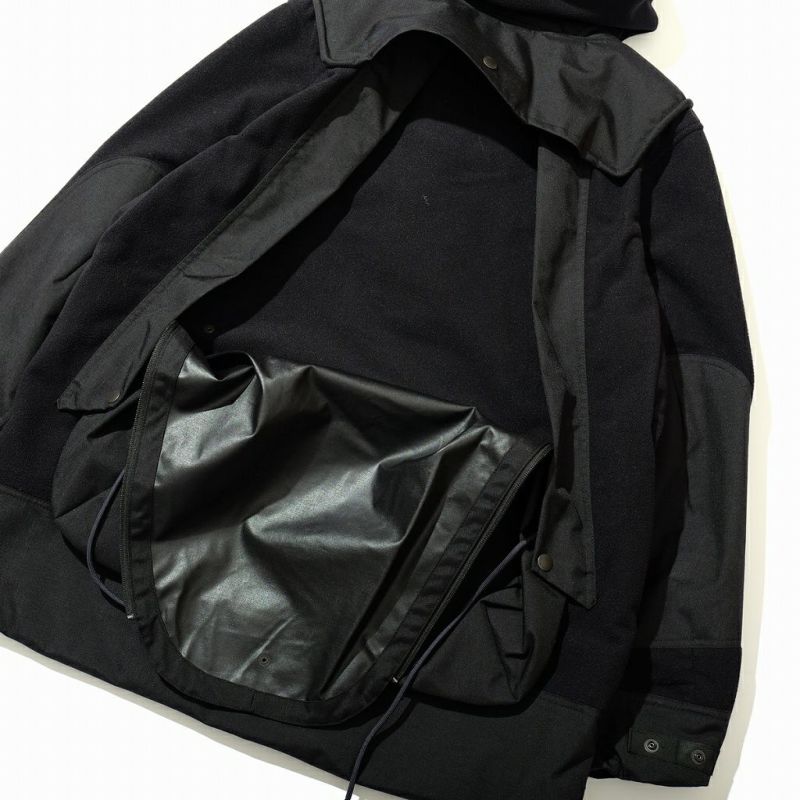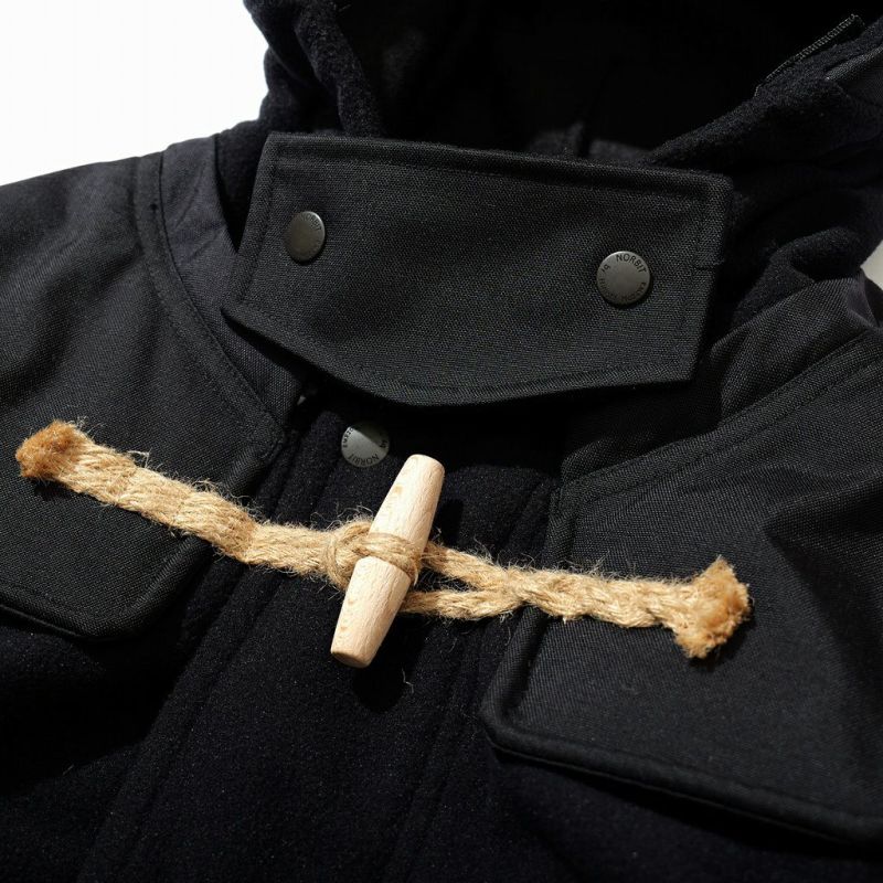 グローバーオール社の代表作でもあるモンティダッフルコートをnorbitの解釈でテック素材を使用し次世代レギュラーラインをイメージし制作しました。 素材は軽量、防寒性、強度をテーマにしています。 メイン生地にはポラテックフリースにメンブレム+静電気防止の起毛トリコットの3層素材。 ポケット、エルボパッチ、フード上部パーツなどにはコーデュラナイロン(ダック裏PUコーティング)を使用しています。 デザインモチーフとしてはモンティダッフルコートのウッドトグルボタン、リネンループとオリジナルアクセサリーを活かしています。 norbitからのデザインキーとしてはハンティングジャケットのポケットワーク、エルボパッチ、背面のジップ付きゲームポケットなどを機能素材の別布を使用しながらハンズフリーを目指す実用的な仕上がりを目指した作品です。 ワイドシルエットのショート丈でカーライフにも適した防寒対応のアイテムです。