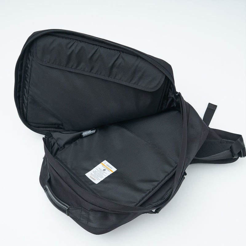 メイン収納内にPCポケットを配置しています。裏地が起毛素材になっており、13インチサイズのデバイスを収納出来ます。左ショルダーハーネスには、スマートフォンやイヤホンなどの小物を収納出来るジップポケットを配置しています。使わないときは、内側に折り込むことで、スマートに見せることも出来ます。本体外装には3つの収納があり、側面のポケットにはペン差しやカードポケットが内蔵しています。
