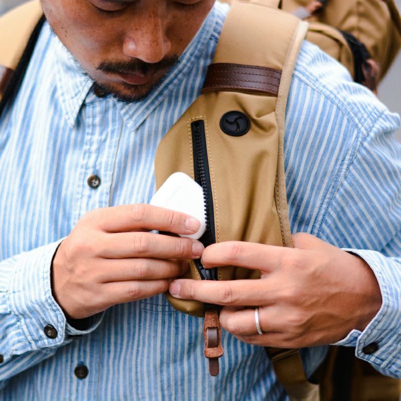 左ショルダーハーネスには、スマートフォンやイヤホンなどの小物を収納出来るジップポケットを配置しています。使わないときは、内側に折り込むことで、スマートに見せることも出来ます。
