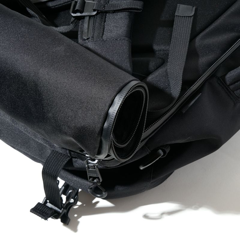 背面のハーネスは、持ち方に合わせて収納できます。背面のファスナーを開くと、ハーネスが現れます。フタ部分はロール状に畳み、バックルによって底面にホールドすることで、バックパックとして使えます。