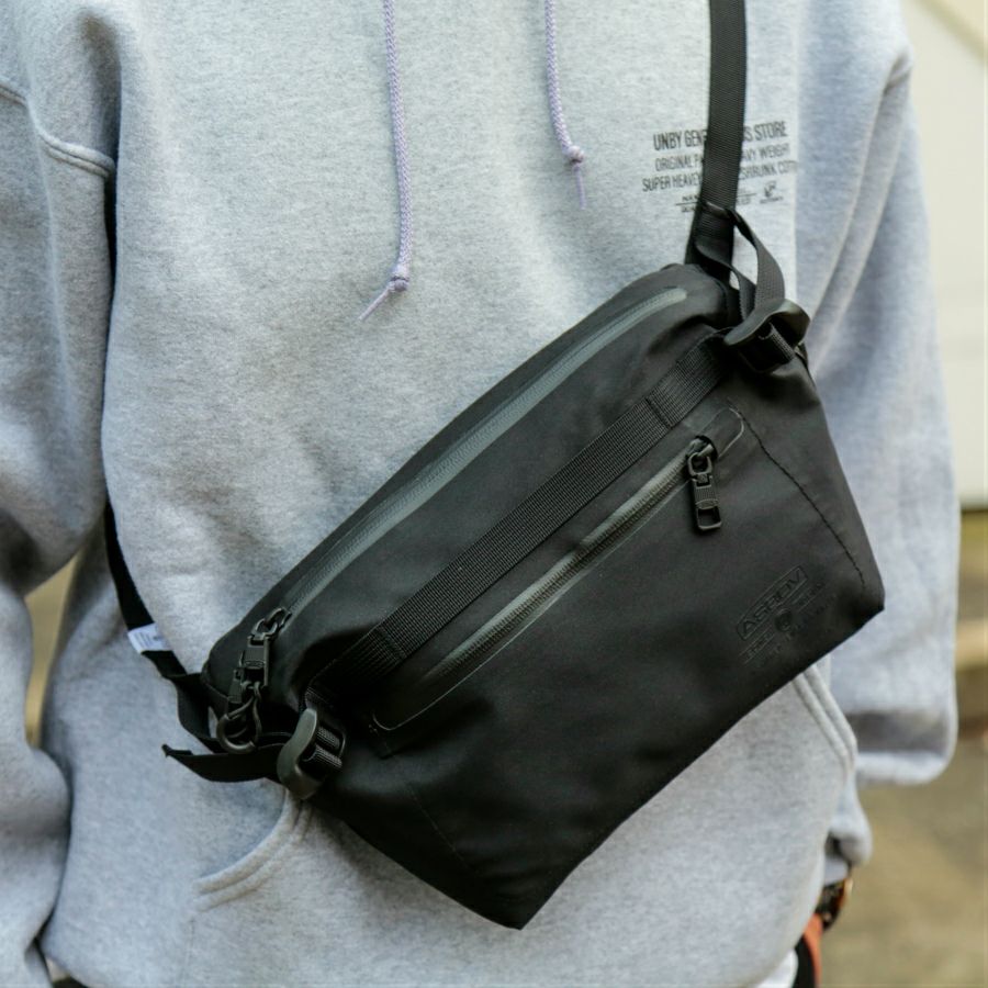 AS2OVデザイナーが開発に2年近く要した、タフで防水なWATERPROOFシリーズのファニーパック。丸みのあるシルエットが特徴的で、ペットボトルなども入る機能的なサイズ感に仕上がっています。生地が厚くないので、折り込んでコンパクトにすることも出来ます。