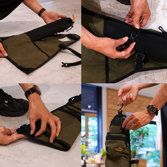 背面の三か所のポケットの中で一番大きいポケットにハンガーを入れ(写真左上)、タオルをかけるベルトで固定します(写真右上)。下部のベルクロを止めると(写真左下)ピッタリ収まるようになっています(写真右下)。