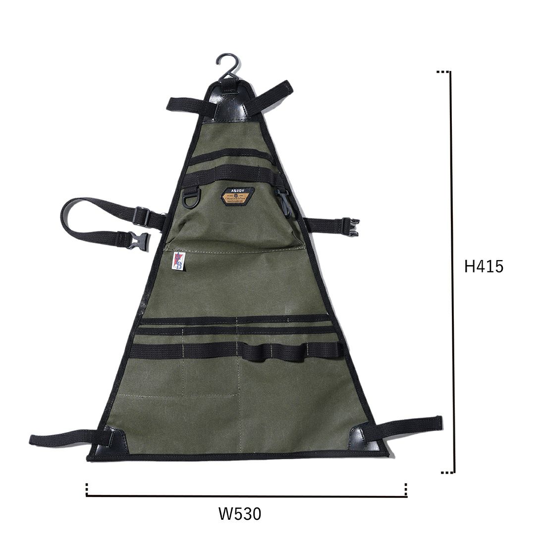 サイドポケットとしてキッチン周りの用具を収納できるのが特徴です。また、本体素材に難燃性のALVERTONのアーミーダック生地を採用しているので、ガストーチ、手袋などを収納し、焚火の近くでの使用が可能になりました。また、背面にポケットとベルトがありタオルなど収納すると火の粉が飛びにくいのでオススメです!