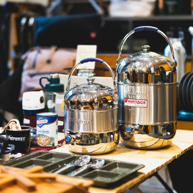 インドのステンレス業界で30年の歴史を持つ会社が作るウォータージャグです。 ステンレス100%で作られていて、見た目も丸みを帯びています。特徴としてお水を出しっぱなしにできます。 保温保冷機能無しなので、手を洗ったりお皿を洗ったり、の場面がいいかもしれません。 保温機能があるものは本国インドではチャイサーバーの定番なんだそうですよ。 キャンプギアにオリジナリティを出すにはうってつけのアイテム。5Lと10Lをご用意していますよ〜軽いです!