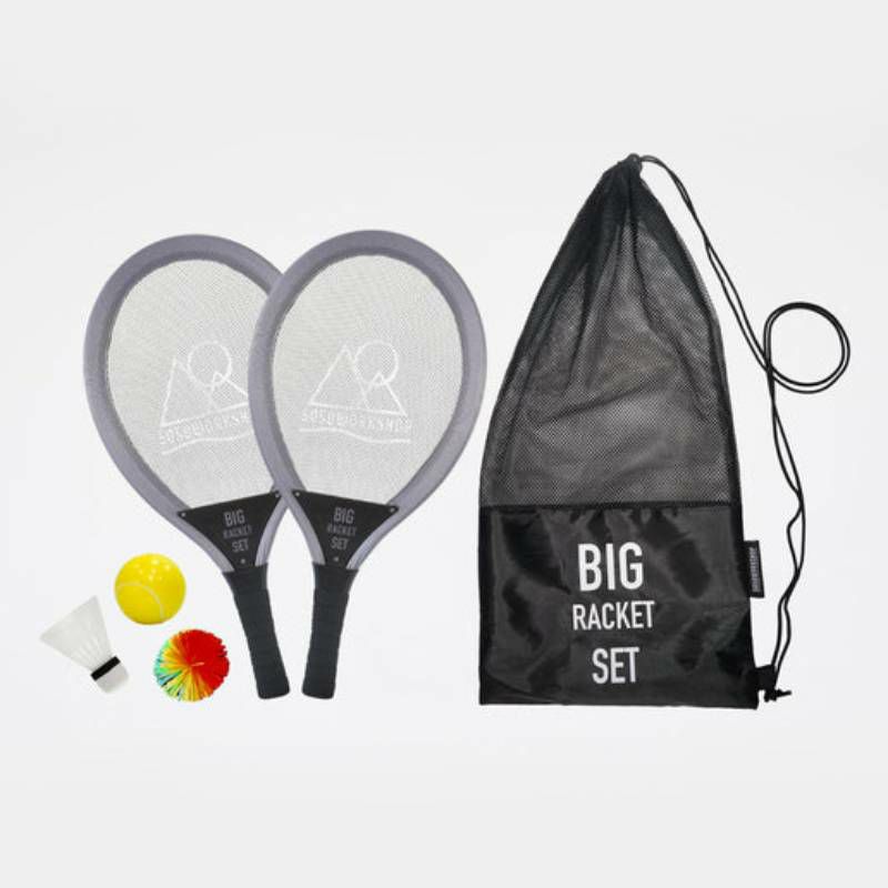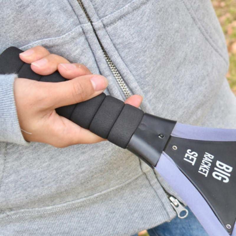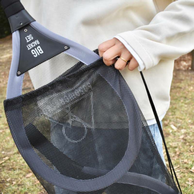 大人も子供も一緒に楽しめるラケットセット ラケットは約99gと軽量で持ち手に重心がありとても振りやすい構造になっています。 持ち手はスポンジハンドル、フレームはプラスチックで出来ているので柔らかく大人はもちろんお子様も、親子で楽しむアクティビティとして最適。 ビックラケットの特徴でもある、ラケット面が広いのでボールが当てやすくお子様でも楽しんでいただけます。 ラケットカラーはグレーでラケット面には、5050のロゴが付いていてシックな雰囲気。 キャンプやレジャー、どこでも持ち運びやすいメッシュバック付きです。 ■ACCESSORIES ・ラケット× 2 ・ボール×1 ・シャトル×1 ・クーシュボール×1 ・収納ケース×1
