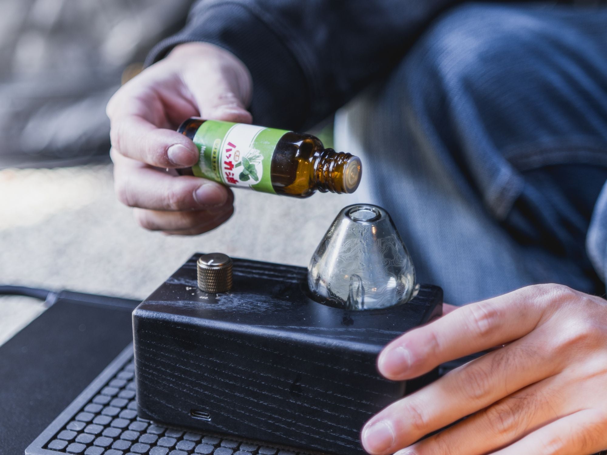 バッテリー駆動で持ち運びに便利なネブライザー式アロマディフューザー。 精油を空気圧で霧状にしたのを噴霧することでアロマオイルが持つ本来の香り、 効果を楽しむことが出来ます。 加湿機能は搭載されていないので湿度の高い季節、地域でもいつでもどこでもご使用いただけます。 ガラス蓋を開けて精油をそのまま注ぐことが出来ます。 注ぎにくい場合は付属のスポイトを使って注ぐことも出来ます。 ハッカ油やシトロネラ油など夏のアウトドアシーンには欠かせないオイルを使用することで、季節問わずお使いいただけます。 ※オイルは付属しておりません。 純粋なエッセンシャルオイルを必ずご使用ください。水、キャリアオイル、水溶性アロマオイルは入れないでください。 噴霧するモードは4パターン。 お好みで噴霧する時間を選択することが出来ます。 付属の専用ケースに収納することで安全に持ち運びが出来ます。