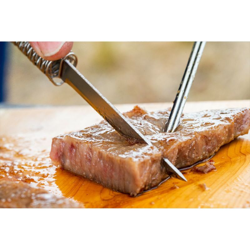 福善初のアウトドア向け調理用ナイフ『銀閃花(ぎんせんか)』でございます。 コンセプトは軽量、コンパクトで持ち運びしやすく、そしてキャンプの定番であるお肉料理を切る和風なナイフです。 調理前のお肉でも鉄板で焼いたお肉でも、販売店で購入した完成品のお肉料理もサッと取り出しスパッと切れる。 そのように手軽に調理が出来るナイフを目指して開発をいたしました。 お肉用に開発いたしましたが、鋭い切れ味の銀閃花は魚や簡単な調理などにもご使用頂けます。