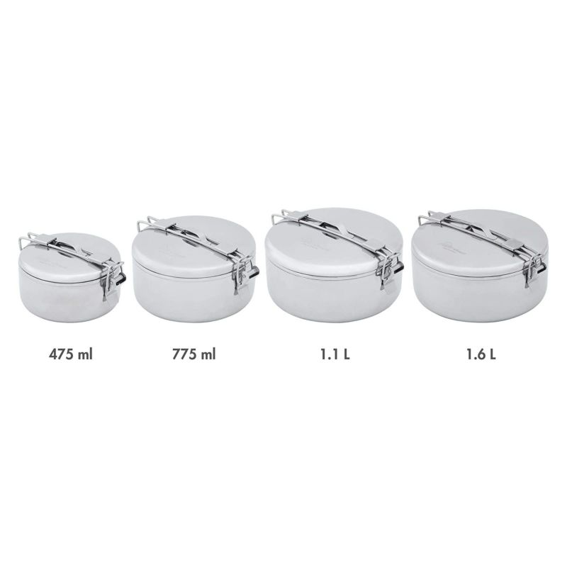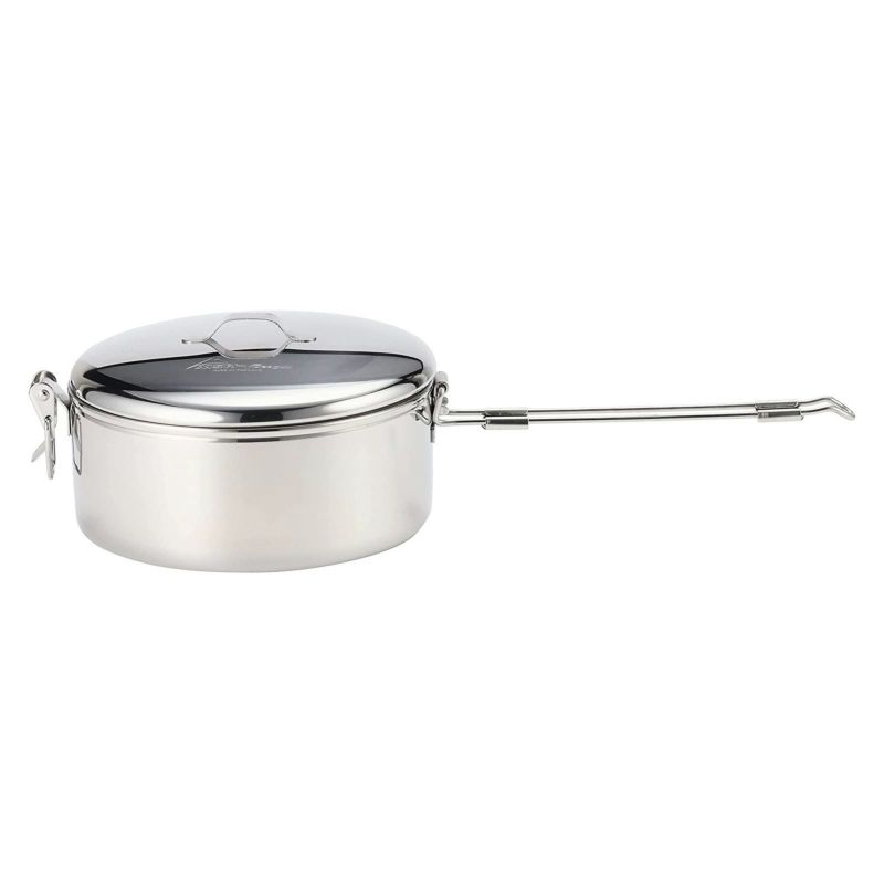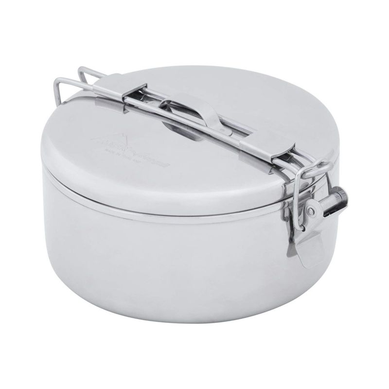 調理と食材の保存に最適な蓋付きのステンレス製ポット。 蓋はヒンジ付きのハンドルでしっかり固定できます。