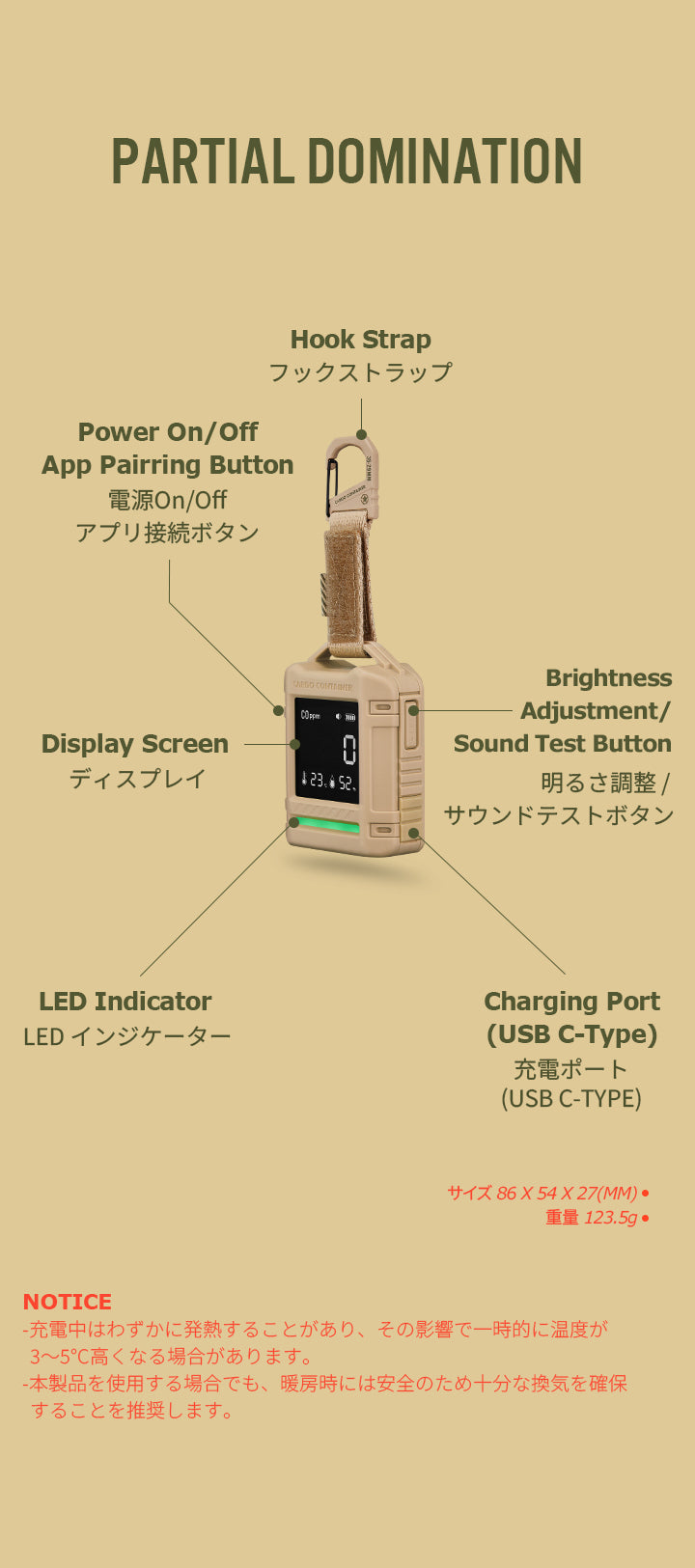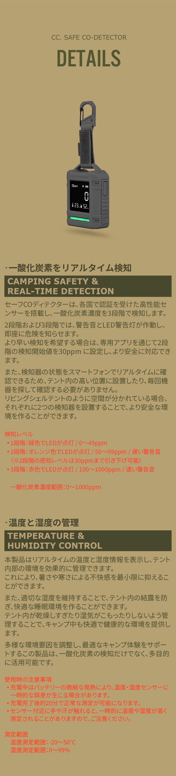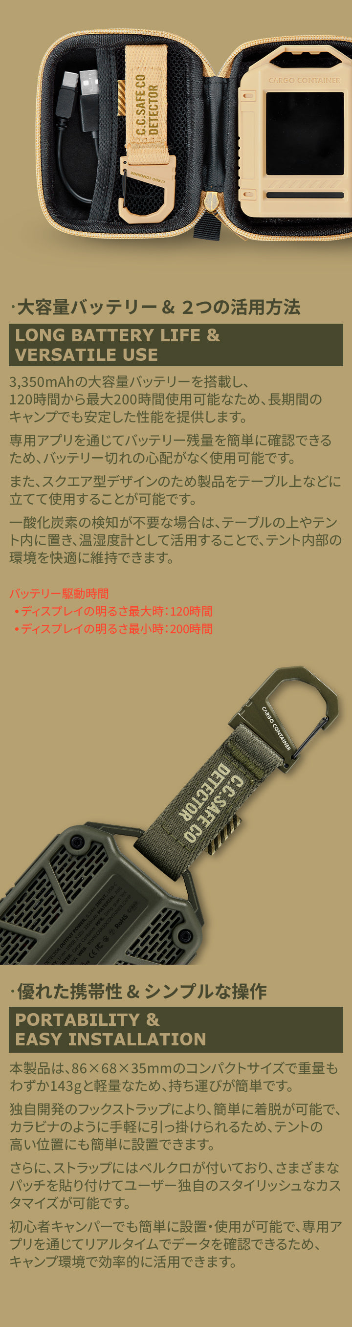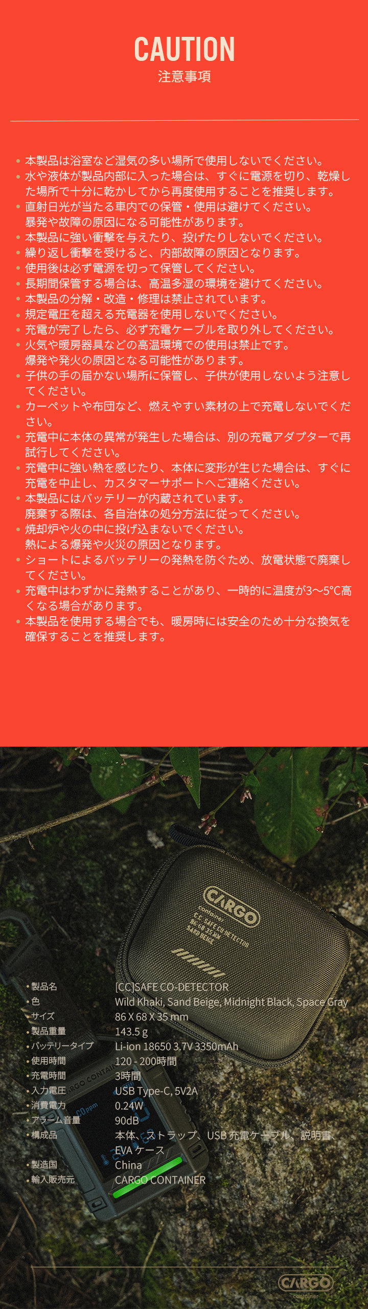 SAFE CO-DETECTORは高性能センサーを搭載し、一酸化炭素をリアルタイムで 検知し、警告する一酸化炭素チェッカーです。 濃度に応じてLEDランプとアラームが作動し、危険を知らせる冬のアウトドアなど で必須の安全装置です。 3,350mAhの大容量バッテリーを備え、ディスプレイ最大輝度で約120時間、 最小輝度で約200時間使用することができます。 専用アプリで、スマートフォンからいつでも状態をチェックでき、温度や湿度もリア ルタイムで確認することが可能です。 四角形のデザインとフック付きストラップにより、立てたり高所に吊るすなどして 使用することができます。 CARGO CONTAINER カーゴコンテナ 都会の複雑さや騒がしさから離れ、大自然の中で自分だけの旅を楽しみたい。「CARGO CONTAINER」は、そんなキャンパーのためのキャンプブランドです。 大切な荷物が大きなコンテナボックスに安全に積まれ運ばれる、そんなイメージから名付けられたブランドCARGO CONTAINER は、唯一無二のキャンプ体験を求める人々に、最も必要とされる製品をお届けします。