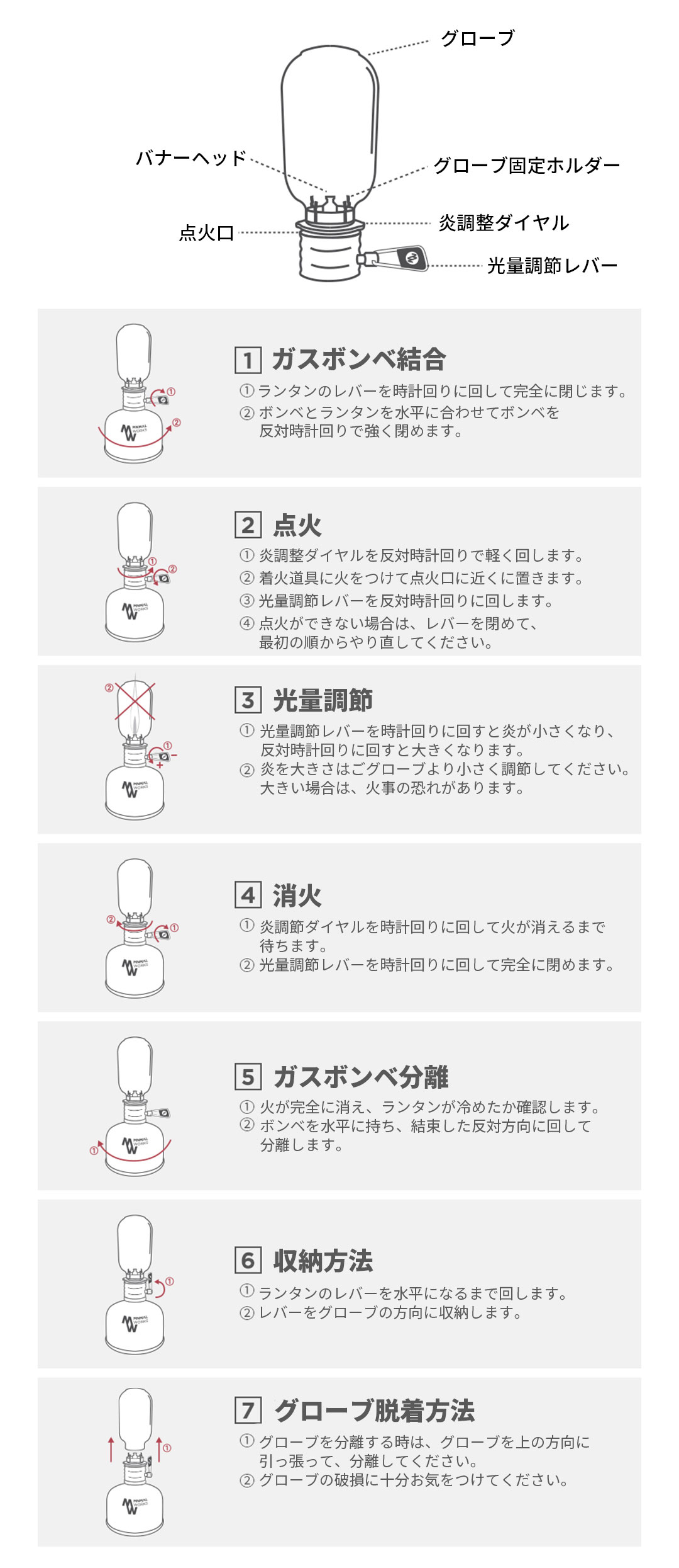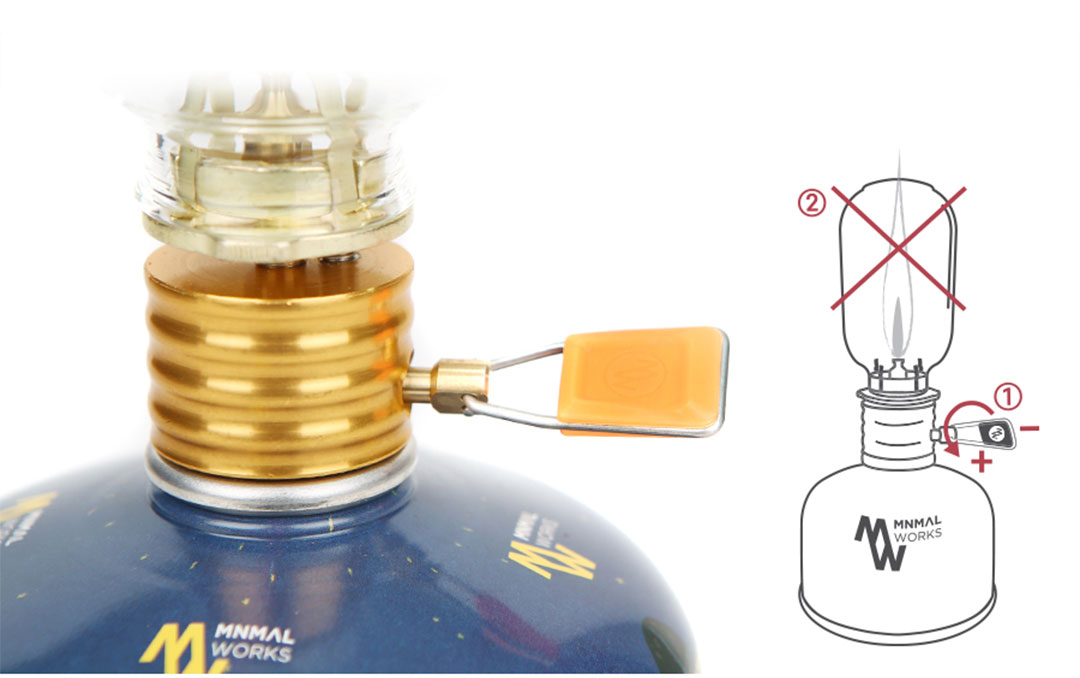 炎調節ダイヤルは半時計回りで回し、少し開いた状態で、光量調節ダイヤルを+の方向に開いて火をつけます。