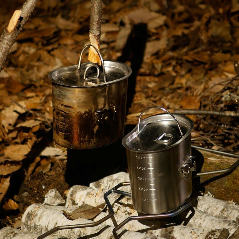 品名が「キャンティーン クッカー キット」となっている・・・。 カップでなく、クッカー? そう、コレ、もう完全にクッカーなんです。単なる湯沸かし用カップではなくなってます! しかも、たき火やアルコールストーブに超特化していたりします。 〇フタとカップを、ロックできるベイルハンドル ベイルハンドルのロック機能を使えば、キャンティーンカップを「吊るす」ことができるんです!これは、本当に画期的です! 今まで、たき火で使うとなると何かと不便の多かったキャンティーンカップですが、Bush Craft Inc.のキャンティーンクッカーキットは、そんな不満を一掃してしまいました! また、ベイルハンドルといえば往々にして、ナベの外側にハンドルが付いていて、取り外しもできず、収納には邪魔でした。 しかし、「キャンティーンクッカーキット」は、まずベイルハンドルが本体の外径より小さく、フタの内側に装着されていることがポイントです。 これにより収納時にも邪魔にならず、フタのほうにハンドルがついていますから、食事中に邪魔になることも皆無です! 〇取り外せる、L字ワイヤーハンドル カップを持つためのハンドルは、直火にかけると熱くなってしまい、グローブ無しでは持つことができませんでした。 グローブをしたって熱くて、少し冷めるまで待つ、なんて場合も多かったですね。 ところが、このキャンティーンクッカーキットのハンドルは、ワンタッチで着脱が可能です。 ですから、調理中は外しておいて、火から上げたら装着すればOK!グローブを忘れても、調理に困ることはありません! 〇樹脂加工 カップ内面に、フッ素樹脂加工をコーティングしております! つまりは、一般家庭で使われている「焦げ付きにくいナベ」と同じ使い勝手なんです! アウトドアでは、完璧な洗浄はしにくいものですから、うれしいコーティングです。 多少の焦げ付きは手洗いで簡単に落とせますし、油汚れやソース系もティッシュでサッとひと拭きです! 〇水切り穴 フタには水切り穴を装備しております! パスタをゆでたあとの湯切りにも便利です。インスタント麺の湯沸かし程度ならフタを外さずにそのまま注げばごみも入りません! 〇汎用性抜群のストーブ! アルコールストーブや固形燃料はもちろん、小さなたき火でもOKなゴトク(ストーブ)付きです。 ゴトク面中央の大きな穴は、アルコールストーブや固形燃料の火柱を遮らない設計なので、十分な火力を発揮します。 たき火に関しても研究を重ね、酸欠鎮火しにくいベストなパンチング加工です! 風防としての機能はもちろん、どのような使用燃料でも火力を最大化するためのこだわりの加工です。 〇もちろん、すべてスタッキング可能! Bush Craft Inc.製キャンティーンボトルも含めたすべてを、コンパクトにスタッキング収納可能です! ※キャンティーンカップについて L字ワイヤーハンドルのロックが緩み、カップが予期せず傾倒する恐れがあります。火傷等にご注意ください。