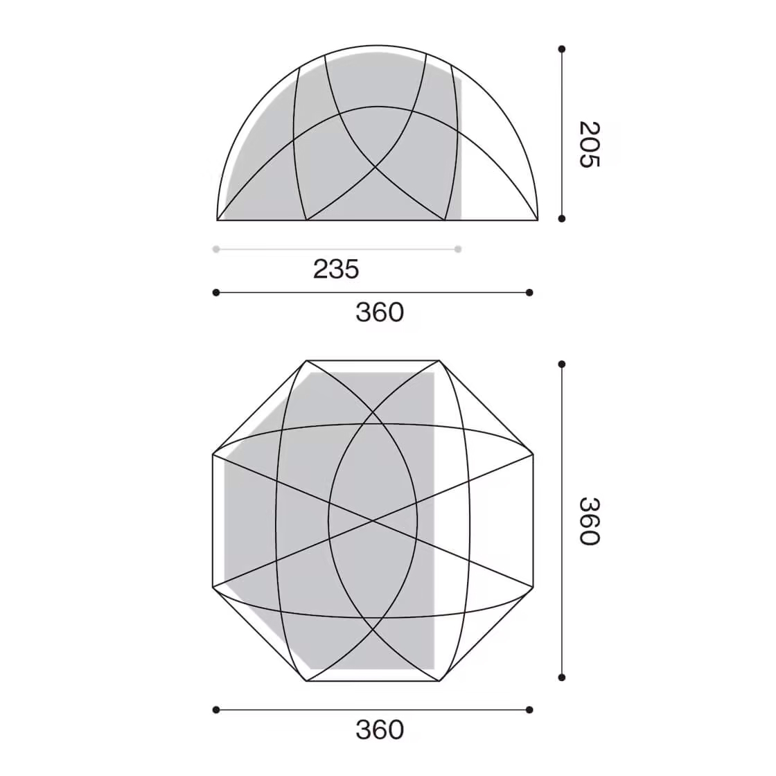 高さ205cm、直径360cmの広々としたサイズ。半球型で205cmの全高は、大人が直立しても快適に活動できます。