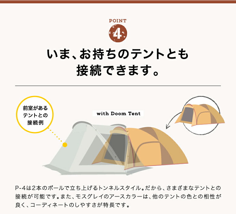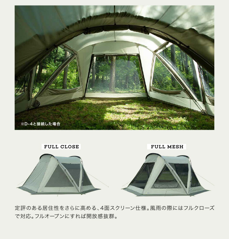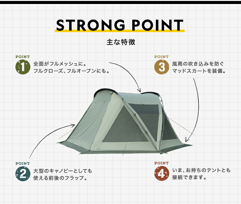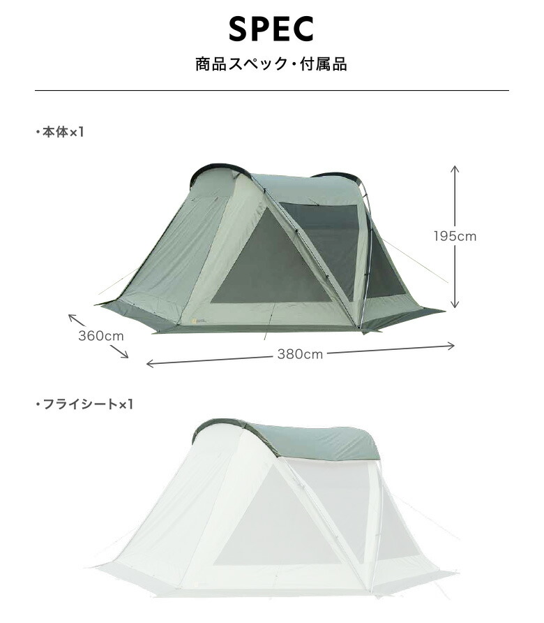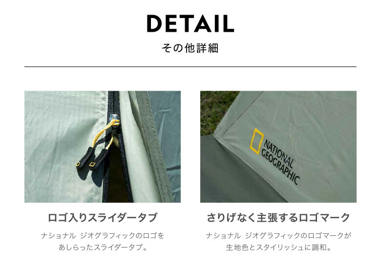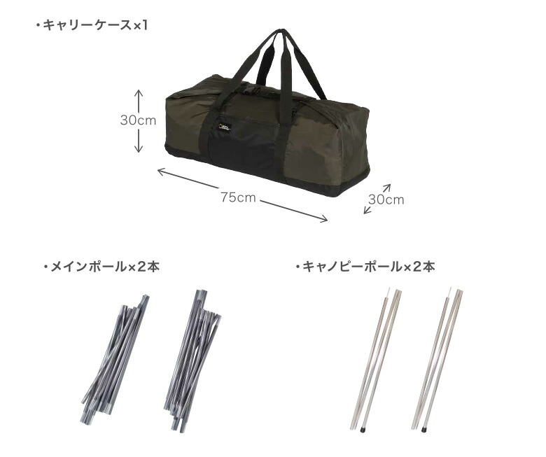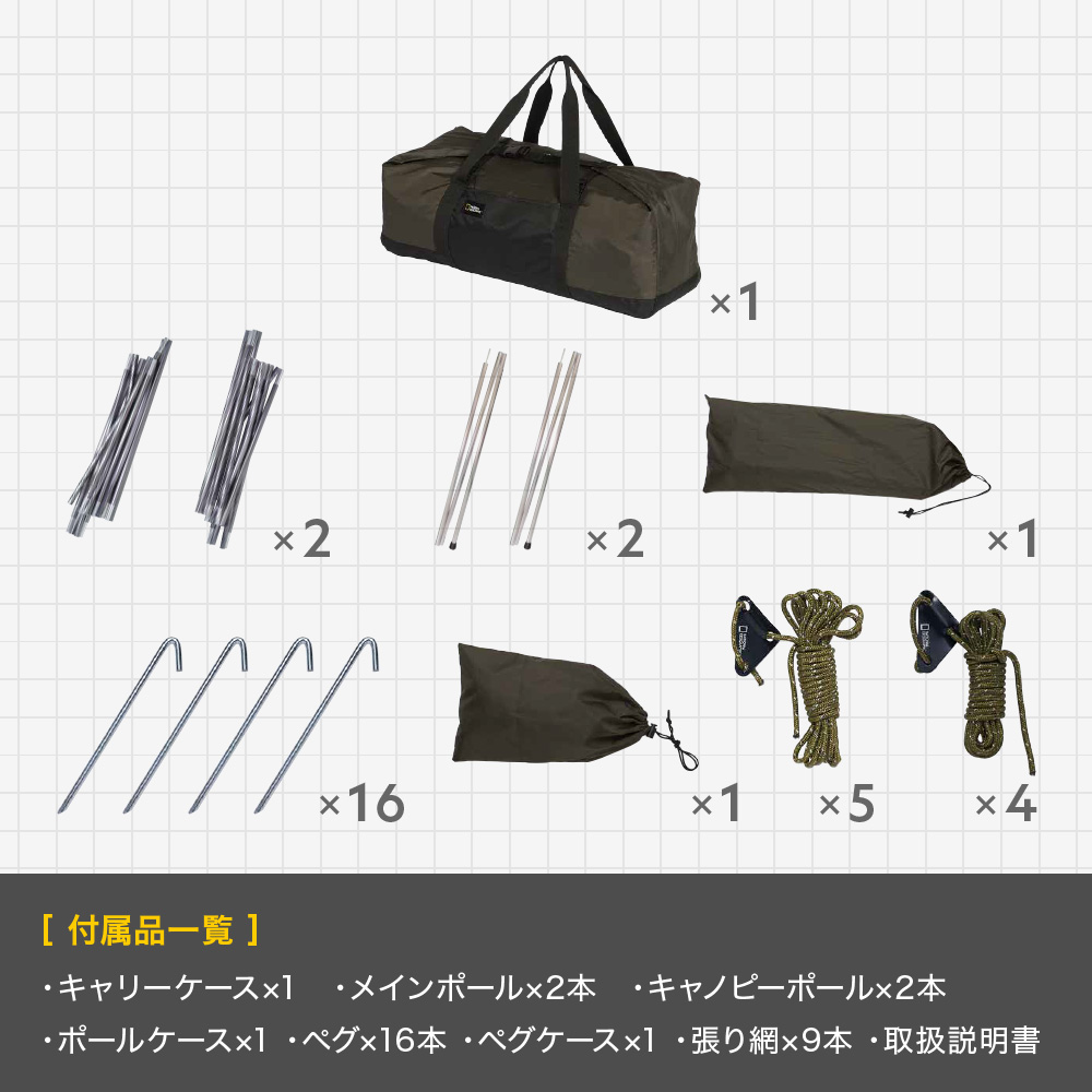 ナショナル ジオグラフィック (National Geographic)と製作したスクリーンタープP-4です。 同社製品のD-4と連結可能。 お持ちのテントとの接続も可能で、快適な居住空間を演出します。 【構成】