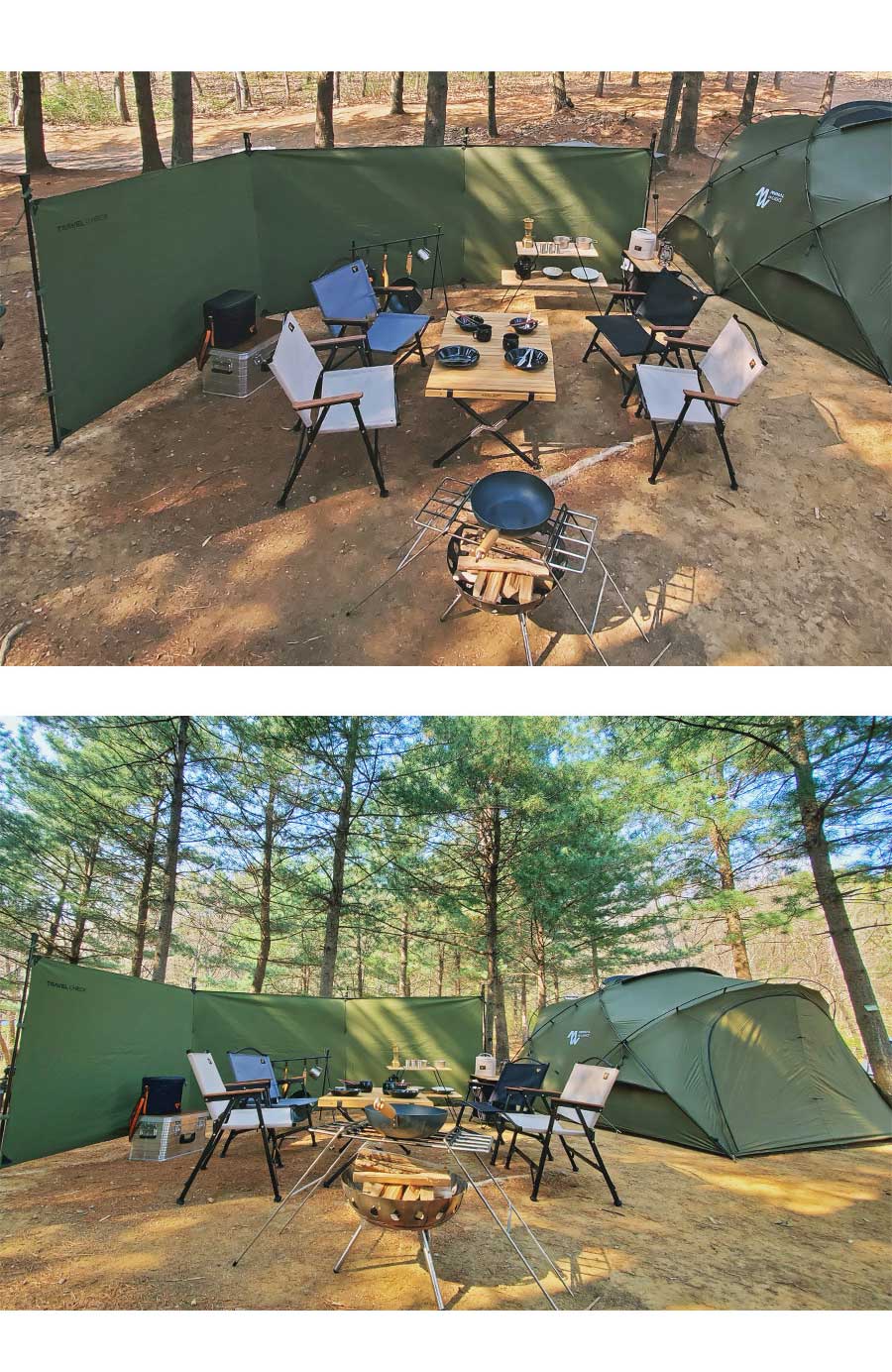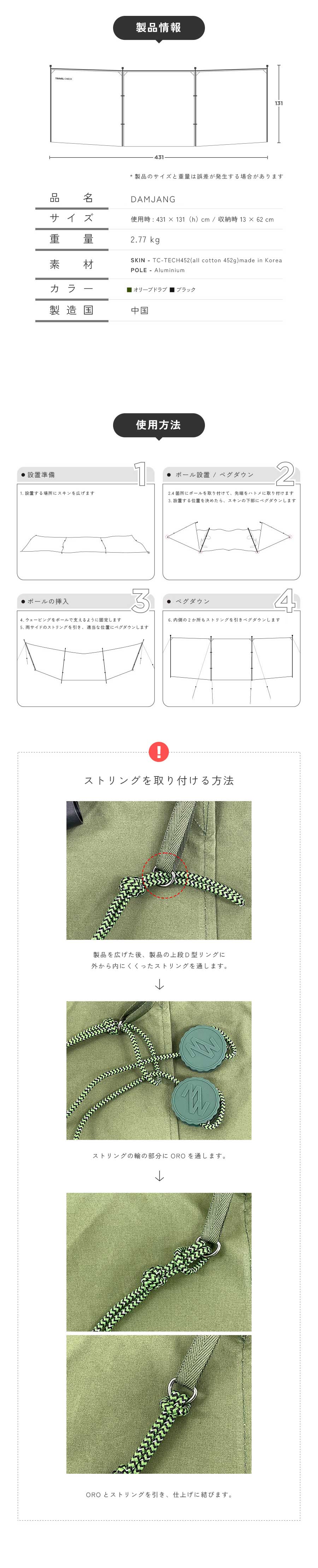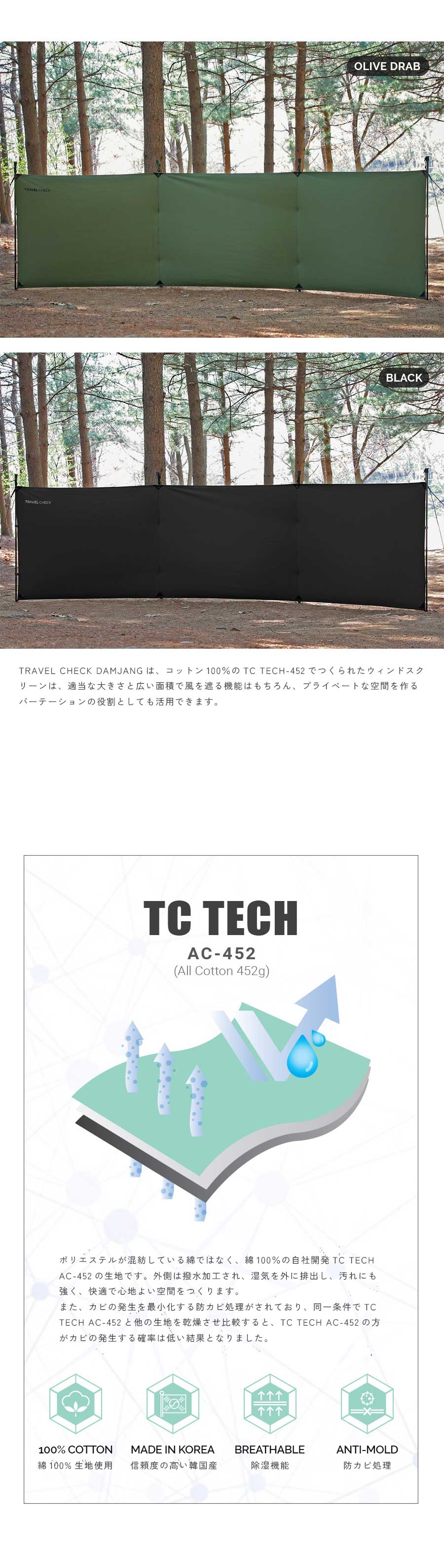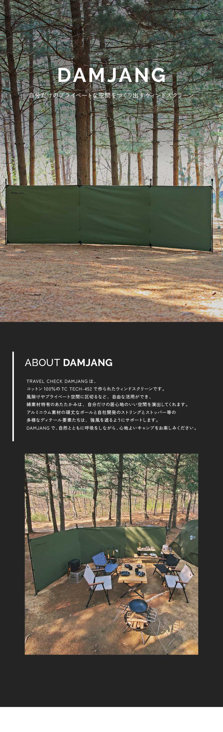 TRAVEL CHECK DAMJANGは、コットン100%のTC TECH-452で作られたウィンドスクリーンです。風除けやプライベート空間に区切るなど、自由な活用ができ、 綿素材特有のあたたかみは、自分だけの居心地のいい空間を演出してくれます。 アルミニウム素材の頑丈なポールと自社開発のストリングとストッパー等の 多様なディテール要素たちは、強風を遮るようにサポートします。