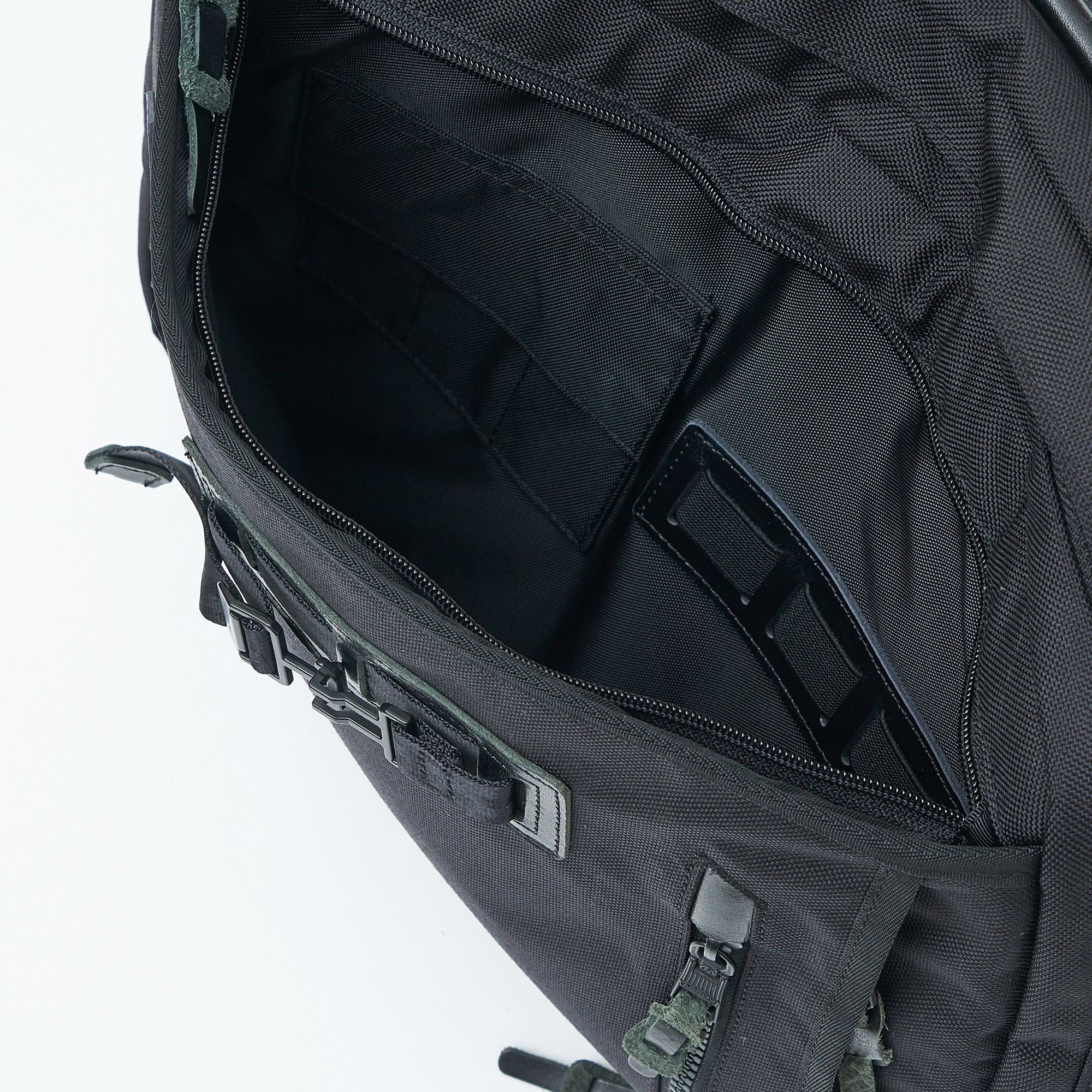 メイン収納内にPCポケットを配置しています。裏地が起毛素材になっており、13インチサイズのデバイスを収納出来ます。左ショルダーハーネスには、スマートフォンやイヤホンなどの小物を収納出来るジップポケットを配置しています。使わないときは、内側に折り込むことで、スマートに見せることも出来ます。本体外装には3つの収納があり、側面のポケットにはペン差しやカードポケットが内蔵しています。