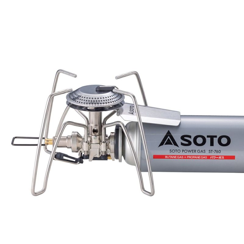 ミドルサイズのクッカー底面を広範囲でカバー 火力も3.3kW(2,800kcal/h)へアップ。 点火アシストレバー標準装備。 低温の外気により、火力低下を起こしやすいCB缶の弱点をマイクロレギュレーターが解消。外気温25℃~5℃の環境下でも常に一定の火力を発揮します。 また、連続使用によるドロップダウンの影響を受けにくいマイクロレギュレーターの特性に加え、Φ66mmの火口により中型(Φ11〜19cm)の調理器具と相性が良く、調理器具の底面を広範囲でムラなく均等に加熱できます。 日本製 ・外形寸法 幅166×奥行142×高さ110mm(使用時・本体のみ) 幅140×奥行70×高さ110mm(収納時) ・重量 360g(本体のみ) ・発熱量※1 3.3kW(2,800kcal/h) ・使用時間※2 約1.4時間(ST-760 1本使用時) ・使用容器 SOTO製品専用容器(ST-760、ST-700) ・点火方式 圧電点火方式 ・材質 バーナー・器具栓つまみ・ゴトク:ステンレス、ボンベホルダー・点火スイッチ:樹脂 ・付属品 収納ポーチ 備考 ボンベは別売です。 ※1 気温25℃無風状態で点火後から5分間の燃焼データより算出。 ※2 気温25℃無風状態で点火後から30分間の燃焼データより算出。 屋外使用専用です。