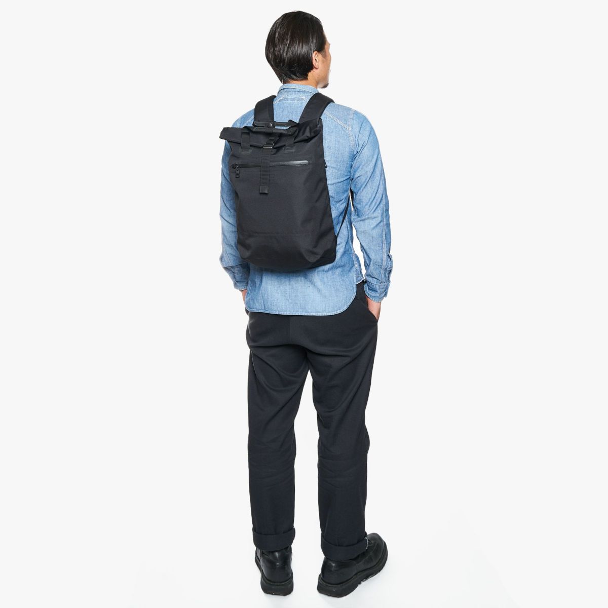 上蓋の上部には止水ジップを走らせた外ポケットが付き、財布やスマートフォン、鍵などクイックに取り出したいアイテムの収納にもってこい。本気を出せば500mlのペットボトルもすっぽり入る収納力も魅力です。