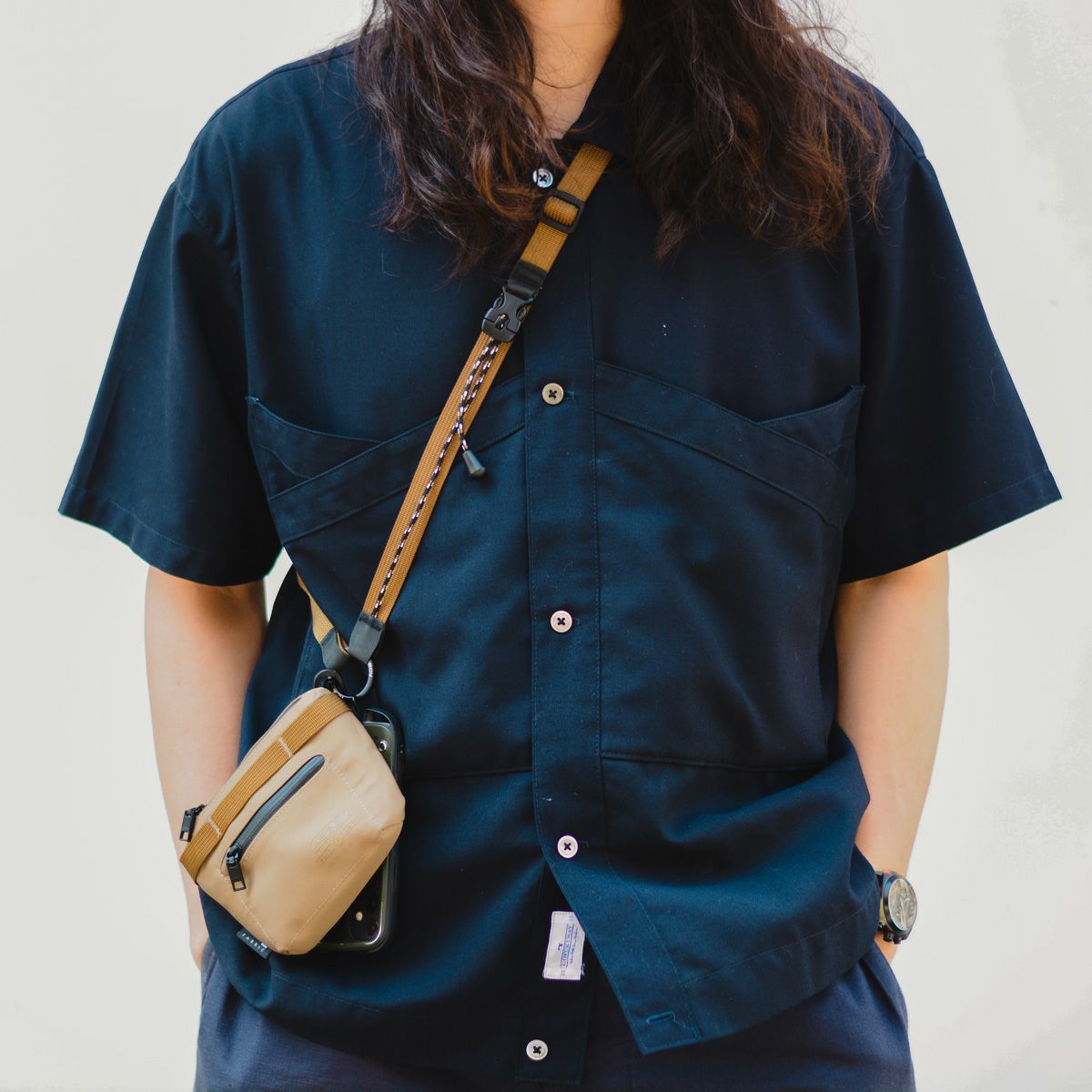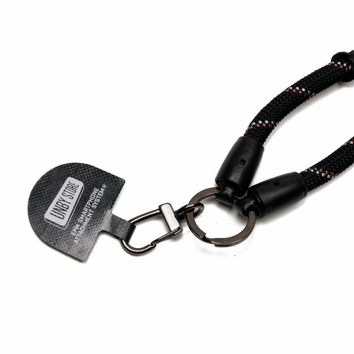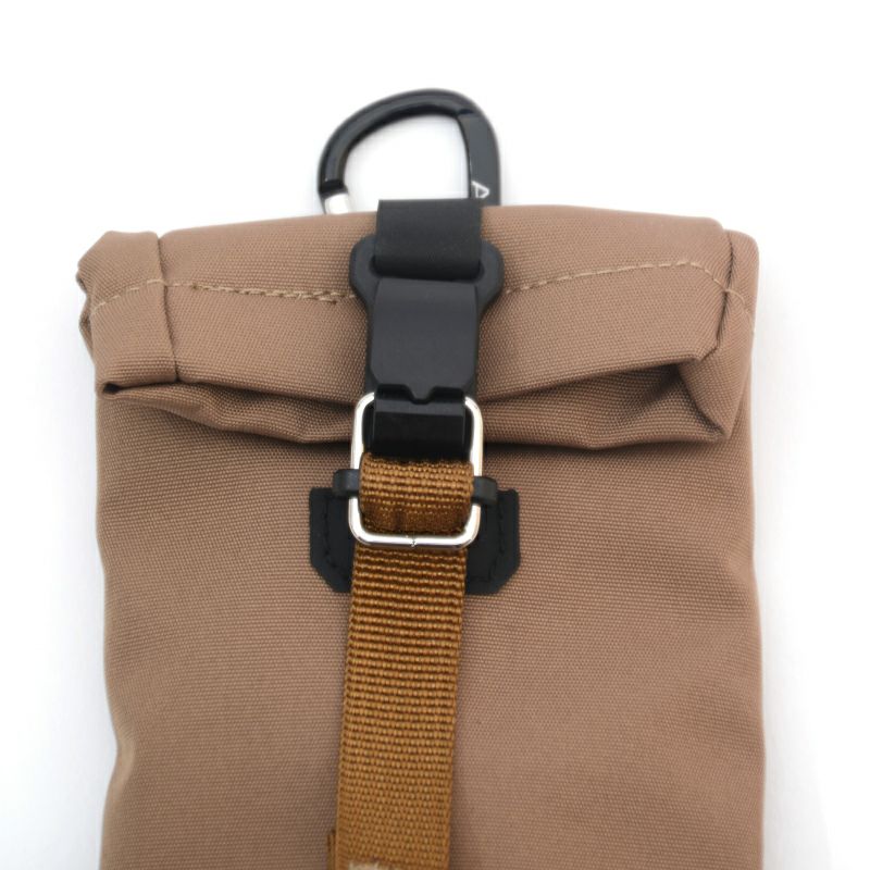 WATER PROOFシリーズの「HABIT SHOULDER」は、スマホを取り付けられるアタッチメントと、好みでモノをぶら下げられる丸カラビナやナイロンループ、クイックに長さ調整ができるドローコードなど、このショルダーだけでもギミックが盛りだくさん。