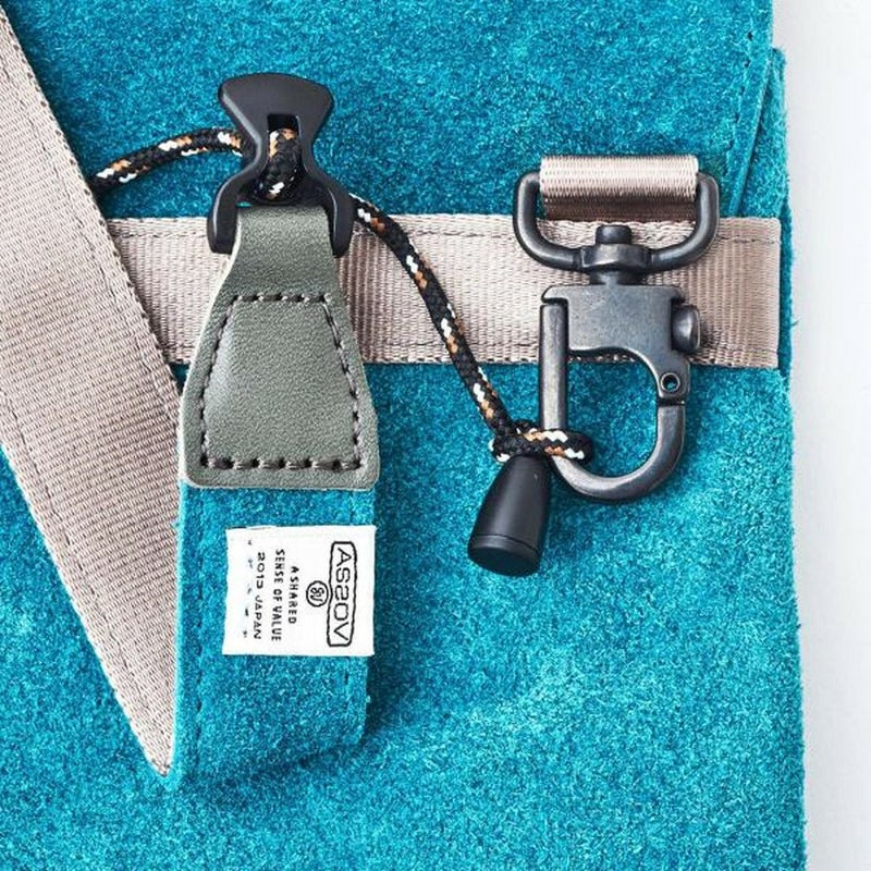 ショルダーの柄紐はAS2OV別注のもので、肩に当たる部分にはレザーとナイロンを使ったパッドを付けています。長さ調節もしやすいアジャスターを採用しています。