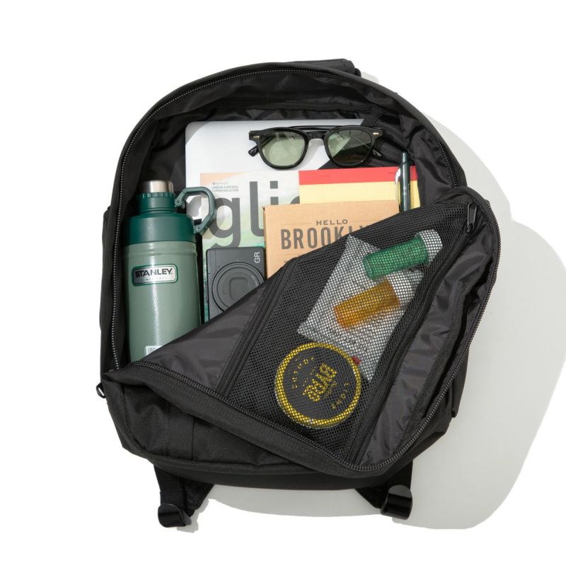 メイン収納はジッパーがコの字型に大きく開く作りになっているので、どこに何が入っているかが一目瞭然。PC用のスリーブと、フラップ側には2段のジッパーポケットで小物も分けて収納できます。