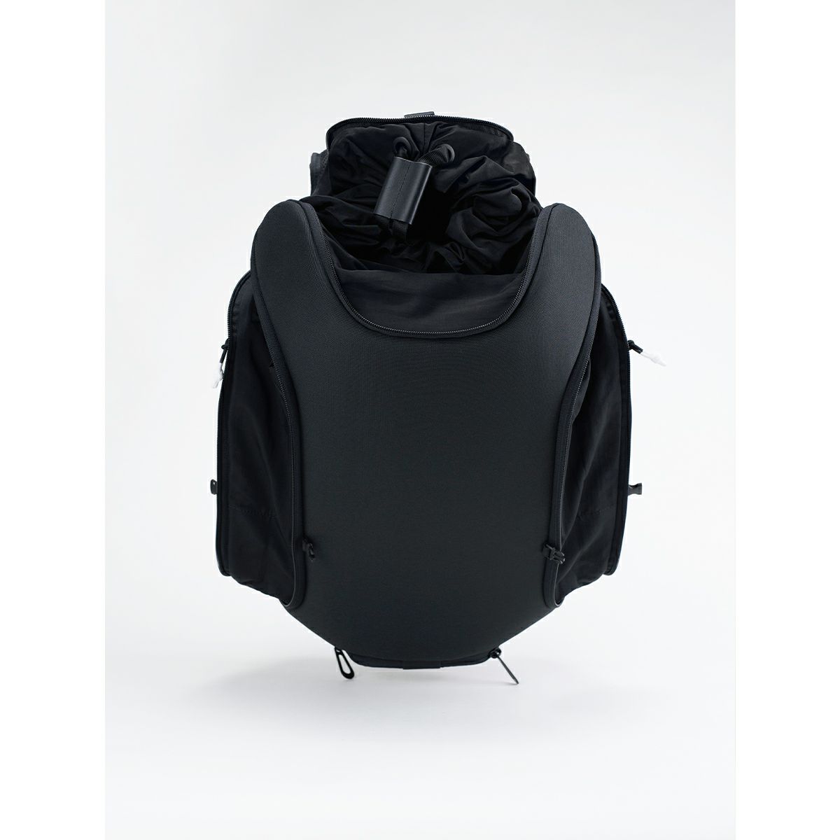 メイン収納はトップの巾着と背面のコの字ジッパーからアクセスが可能で、本体の両サイドにはスマホや財布、コンパクトな折り畳み傘が入るほどの大きさのポケットが2つ。