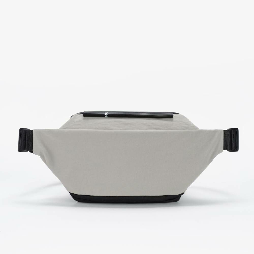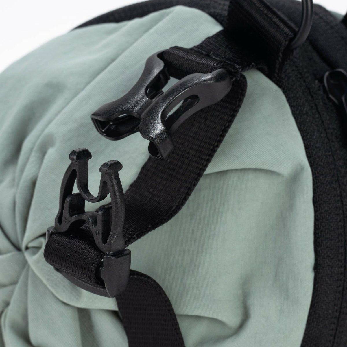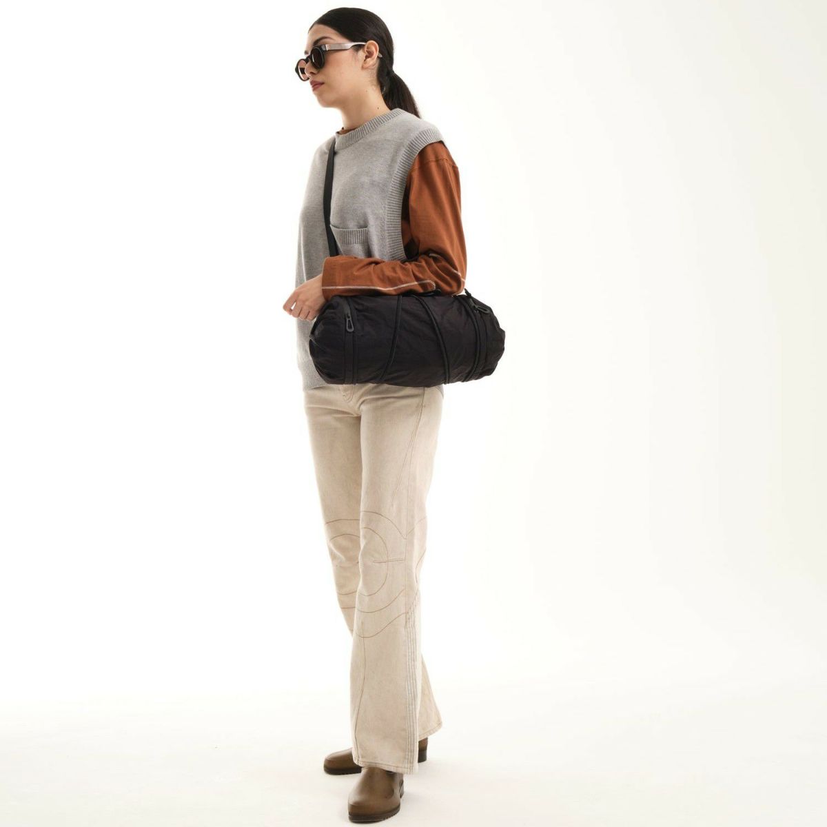 ポケットが収納されている両端の生地に独特のひねりが加えられており。 。中央のジッパーでバッグを小さなダッフル バッグの形に広げると、ジッパーでアクセスできる中央のコンパートメントが現れます。