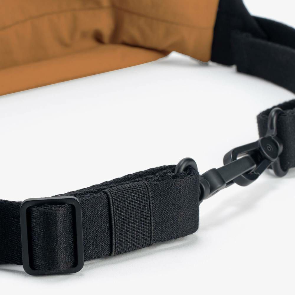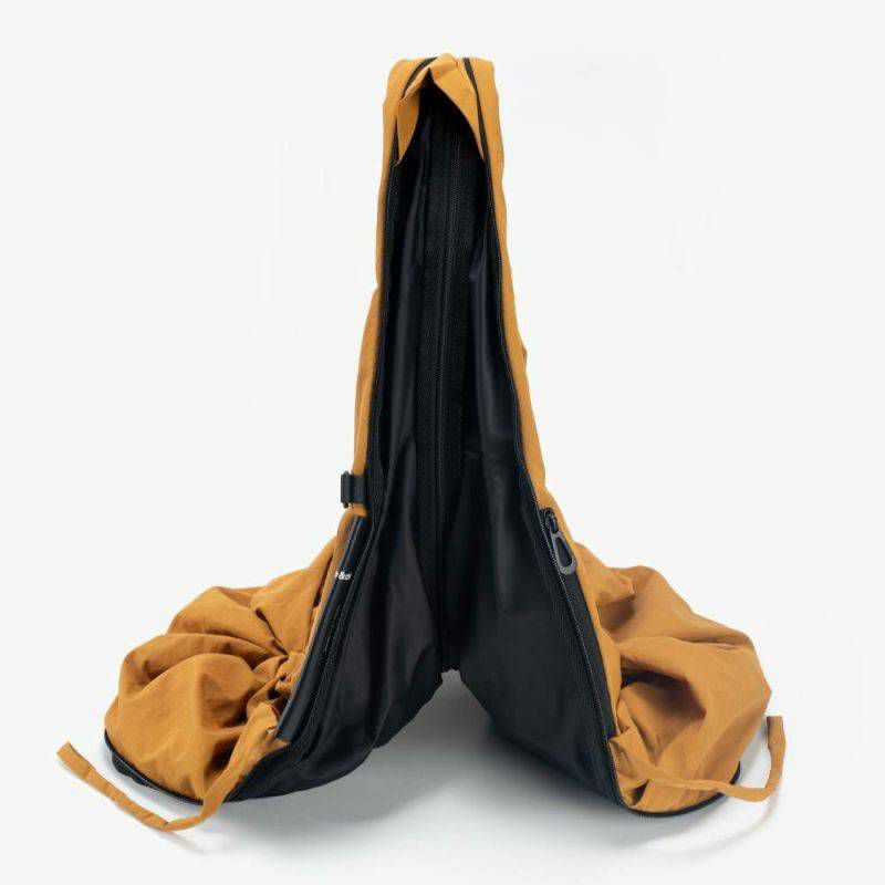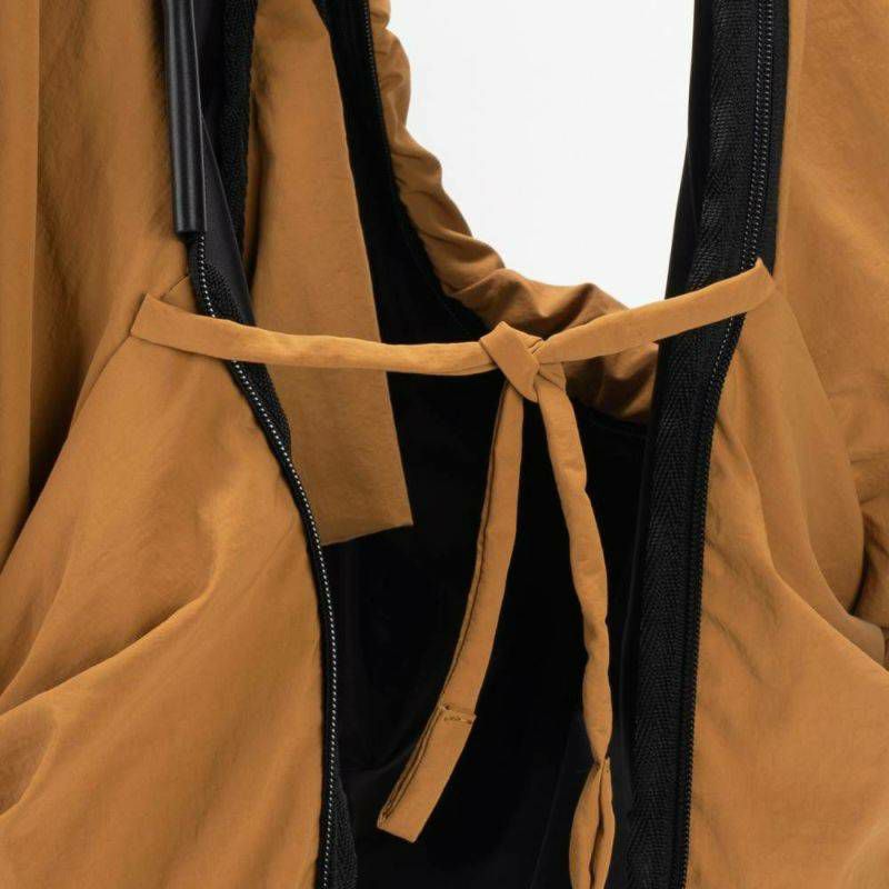 POは、トートバッグとしてだけでなく、瞬時に着用可能なジレに変形できるハイブリッドバッグです。これは、côte&cielの理念「持ち運ぶのではなく、身に着けるバッグ」を体現しています。中央のジッパーを開くことで、POのもう一つの形が現れます。