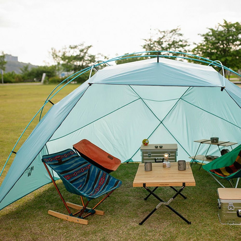 全ての壁面が解放できるので、夏季から冬季までオールシーズンで使用できます。サイドウォールがほぼ直立しているので通常の湾曲した作りのシェルターよりも圧迫感がない上、実際に広く使えます。