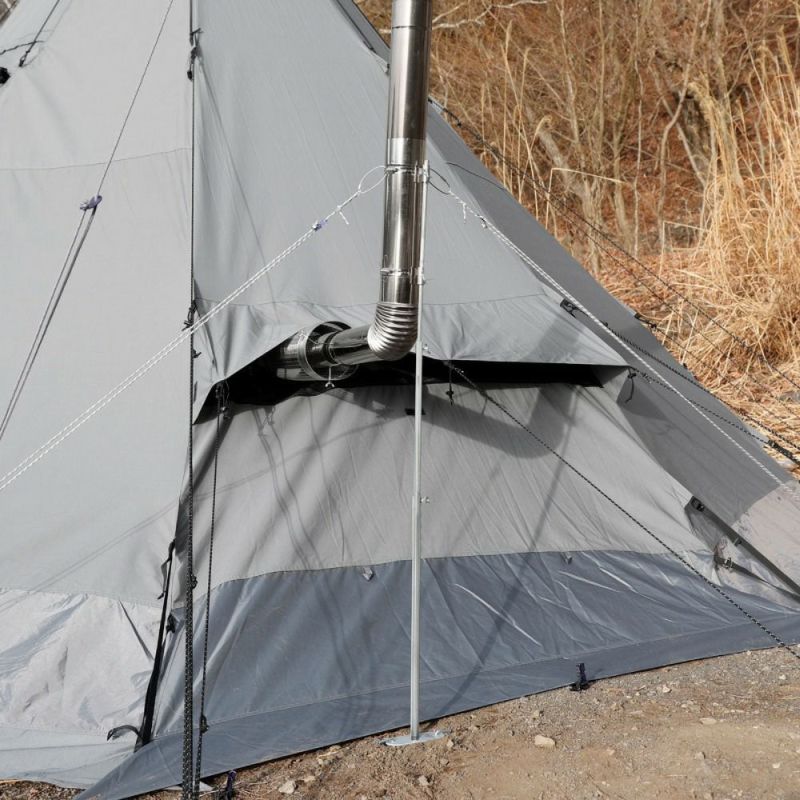 横出し / 斜め出しの煙突を支える 煙突スタンド 内容 : ・本体 (60~145cmに伸縮可能) ・煙突用固定リング (φ58~85mmの煙突に対応、ワイヤーリング無) ・フック × 2 ※ペグダウン用のペグ・ロープは付属しません。 POINT.1横出し / 斜め出しの煙突を支える専用スタンド ストーブの煙突を横出し / 斜め出しする際に煙突を支える専用スタンドです。 ステンレス製でサビにくく、固定金具をネジで留めるだけの簡単取り付け。 3段階の伸縮式で収納はコンパクトに、最大145cmまで伸ばすことができるので、さまざまなシーンでご使用いただけます。 Mt.SUMIの薪ストーブの煙突すべてに取り付けが可能です。 POINT.2ベースの固定で安全に ベースの穴にペグを使って地面に固定できます。 風にも強く、安全にご使用いただけます。 ※ペグは付属しません。直径10mm以下のペグをご用意ください。