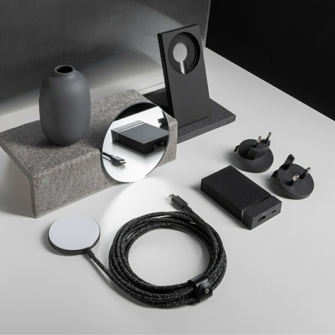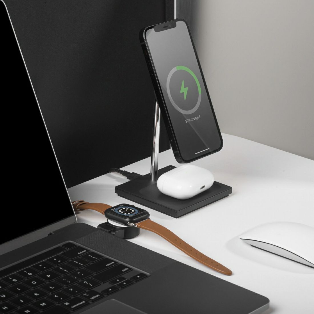 左手にすらりと伸びるiPhone用のマグネットスタンド、右手にはワイヤレスイヤホン用のポケットが配置され、奥には追加のUSB-Cポートも備え他のデバイスの充電も可能に。3デバイスの同時充電ができるのにコンセントからの配電はコード一本で、デスクの隅にピッタリと収まるサイズ感、ネイティブユニオンの本気度がうかがえます。