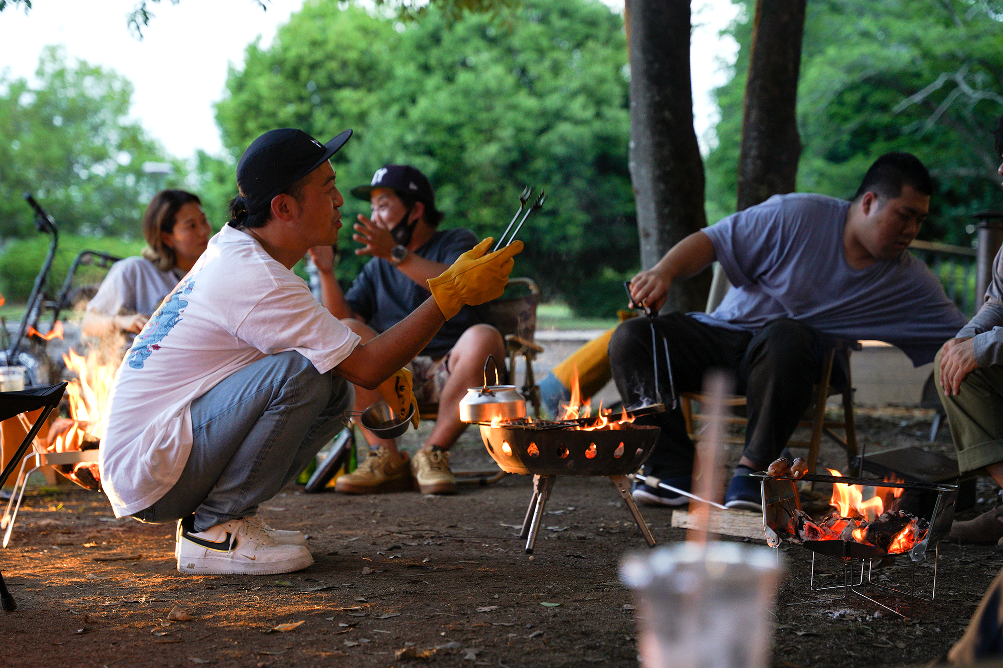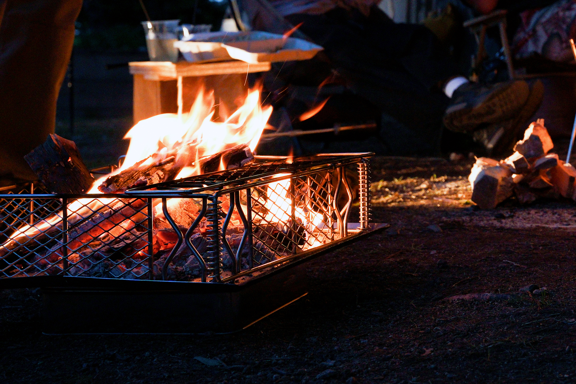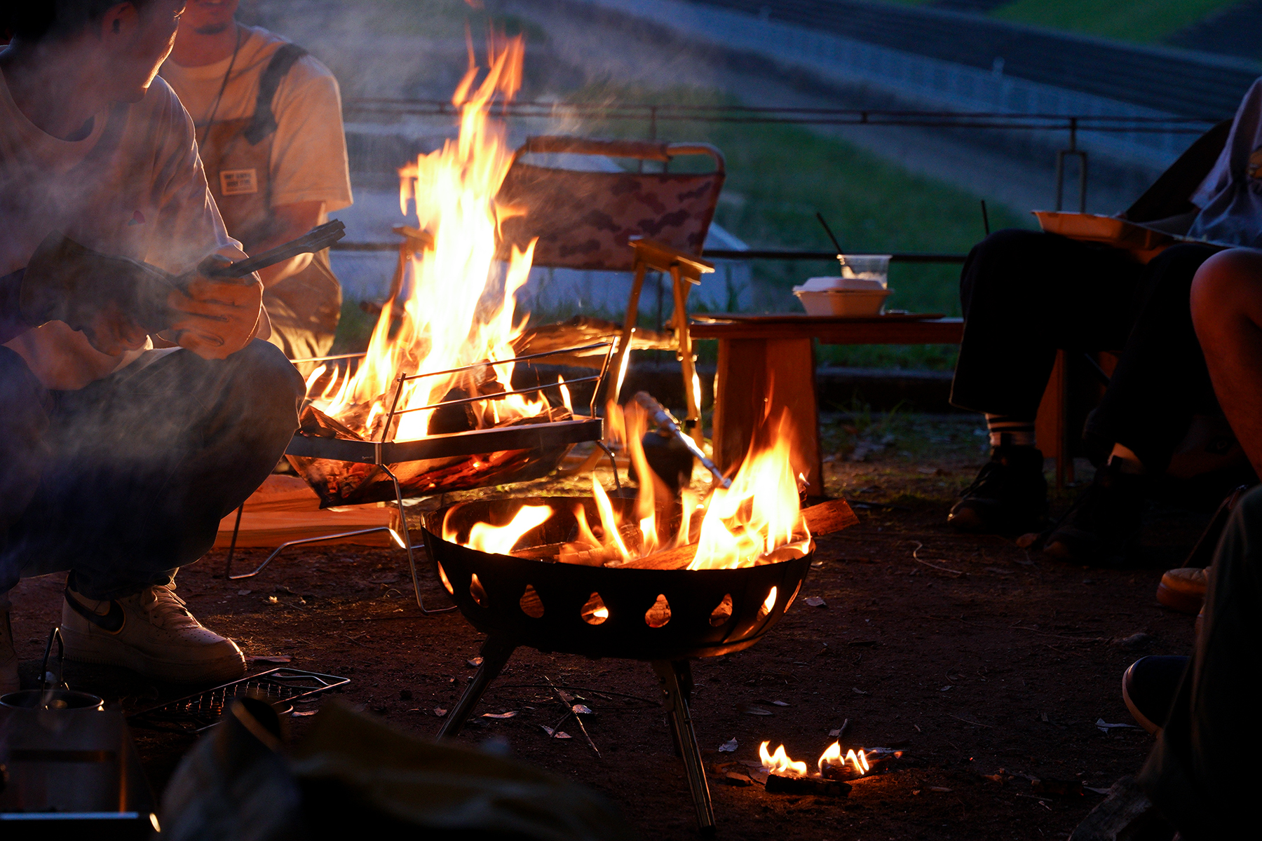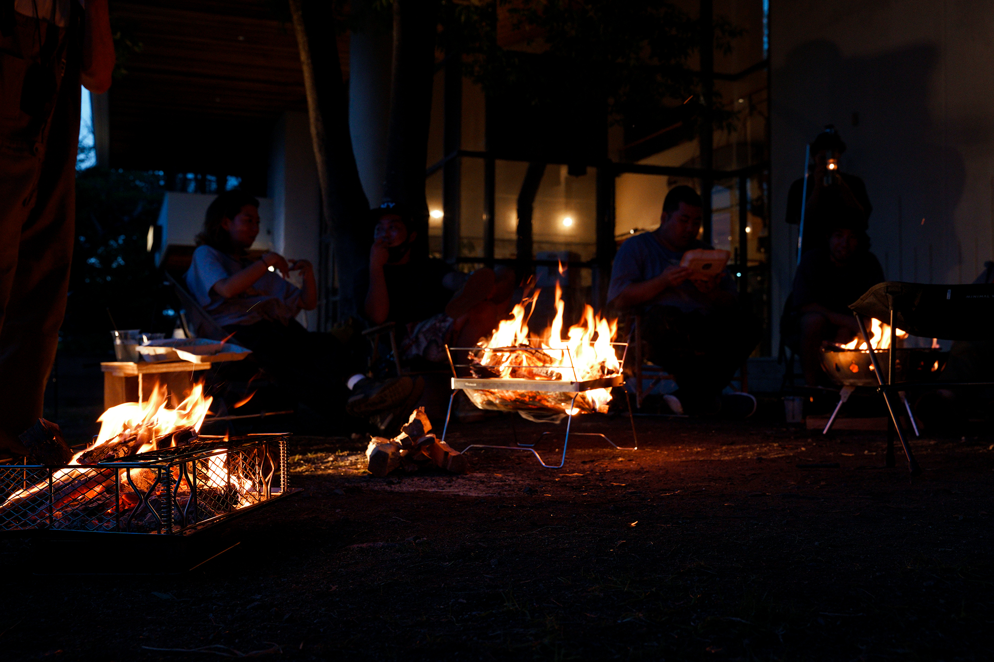 19時半を回ると日も落ち、焚き火の炎が本領発揮をする時間。薪の燃え方も焚火台によって様々で、そういったことを比べられるのも楽しみの一つ。
