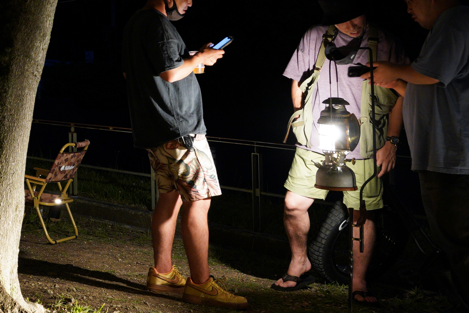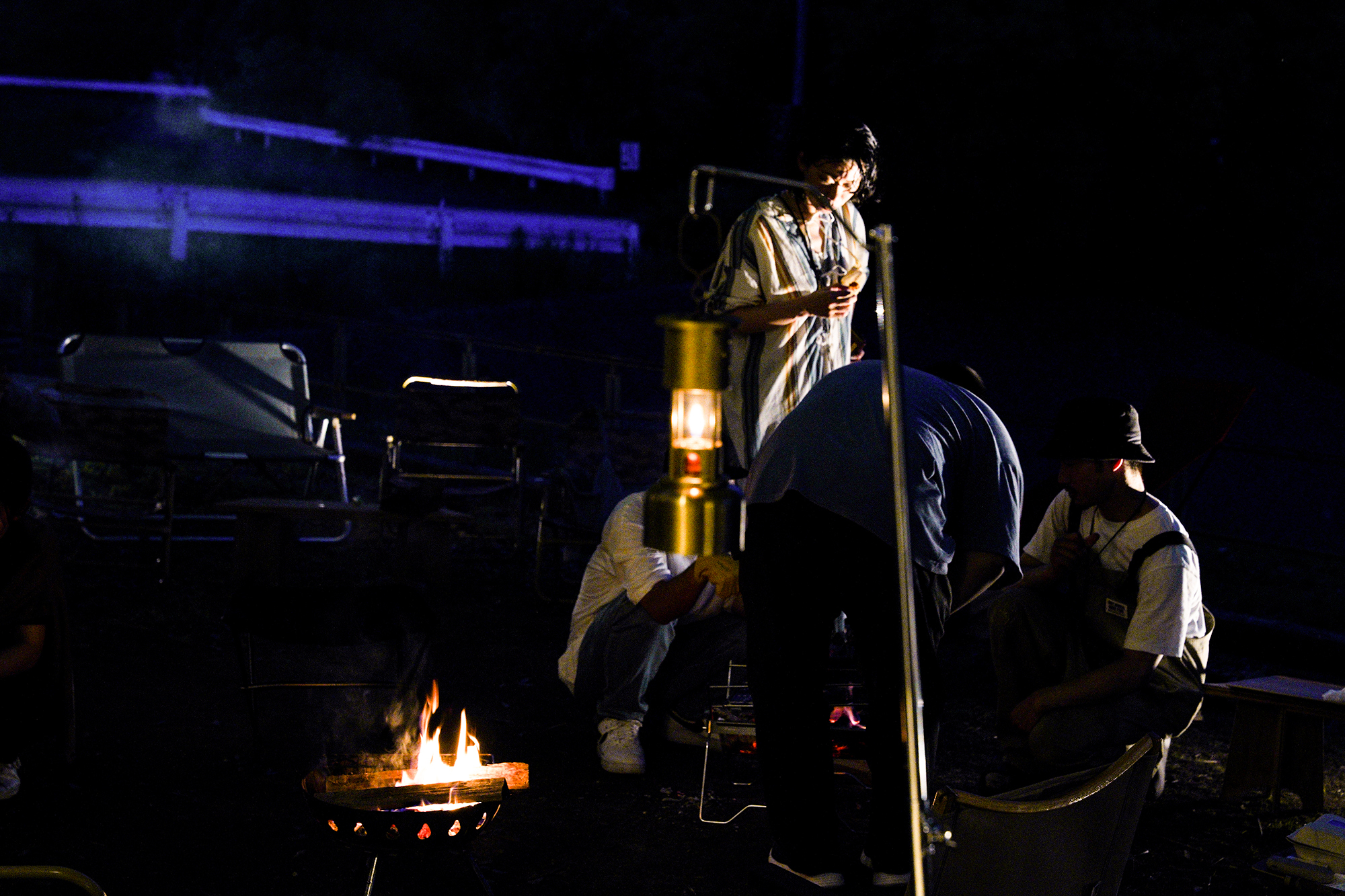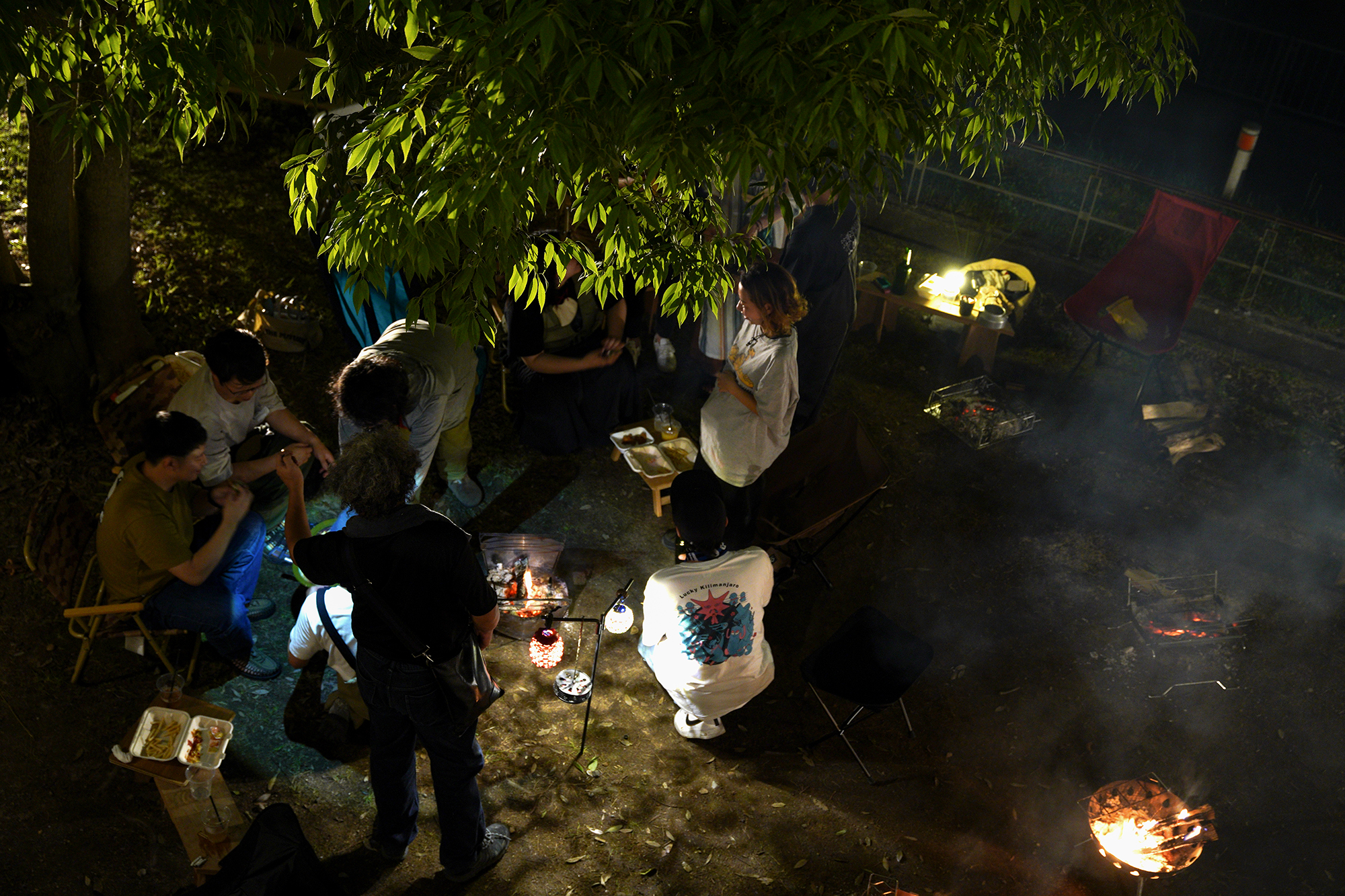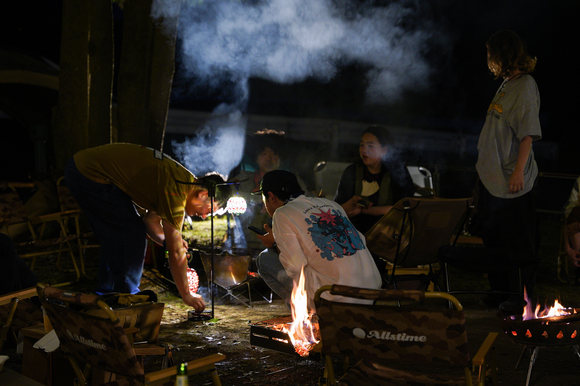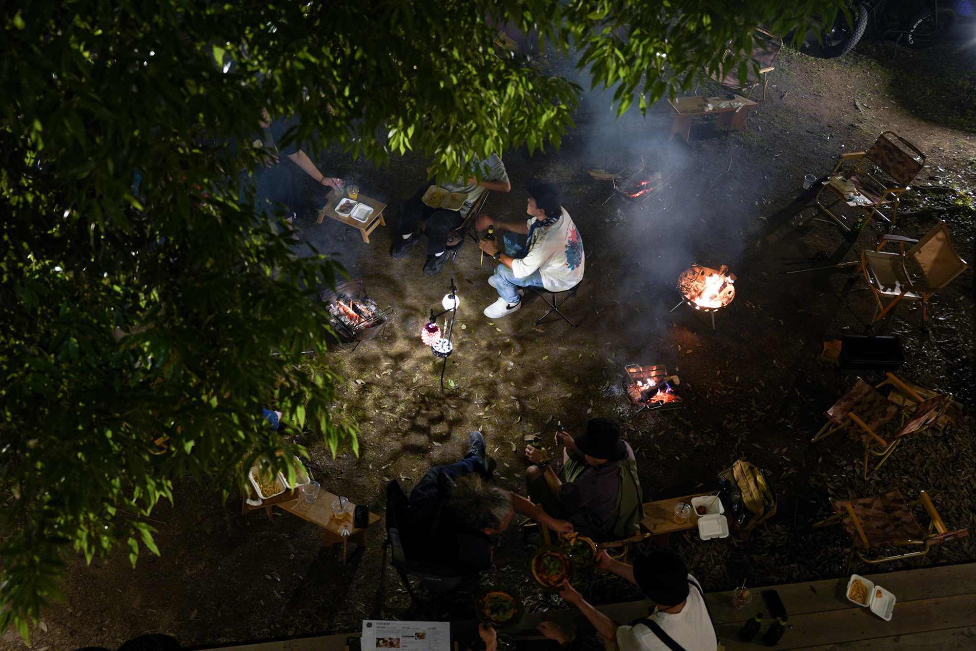 19時半を回ると日も落ち、焚き火の炎が本領発揮をする時間。薪の燃え方も焚火台によって様々で、そういったことを比べられるのも楽しみの一つ。