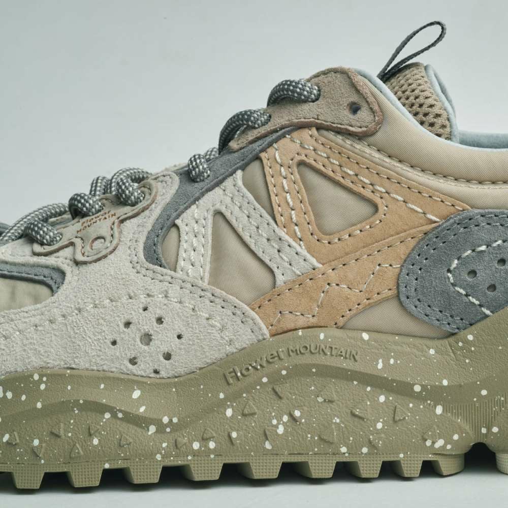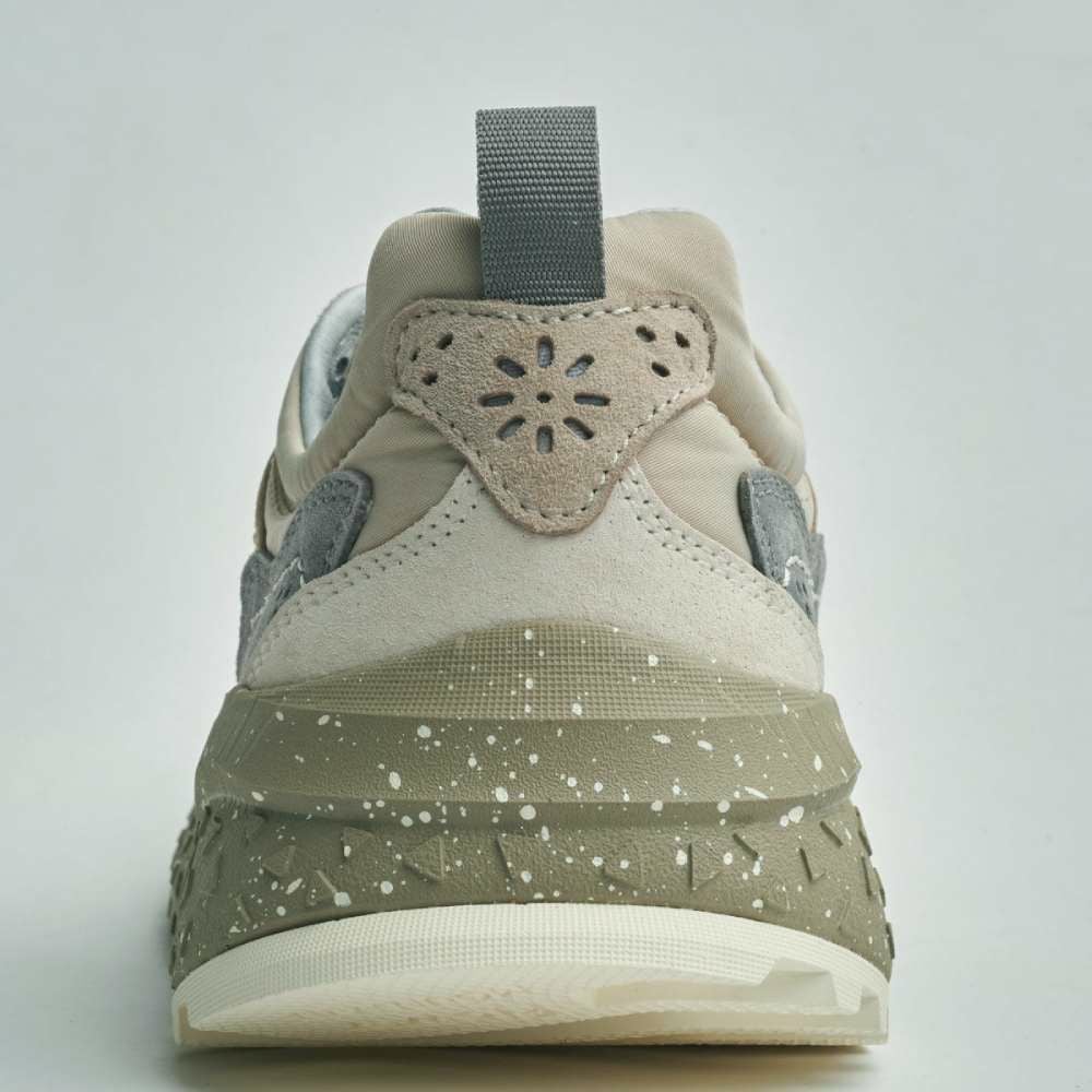 有機的な曲線を描くステッチワークと、ベージュ×グレーの柔らかな配色が、重たくなりがちな足元を軽やかに彩ります。
