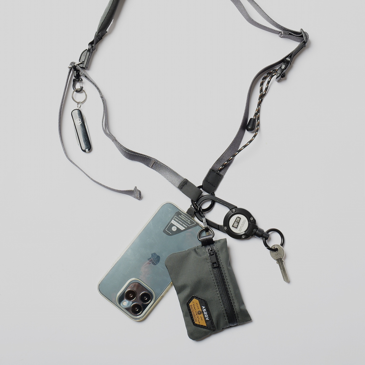 ショルダー部分にはウレタンを入れて、重さを軽減する仕様。携帯を取り付けられるアタッチメント、丸カラビナやナイロンループ、クイックに長さ調整ができるドローコードなど。このショルダーだけで普段使いのアイテムをフォローできます。
