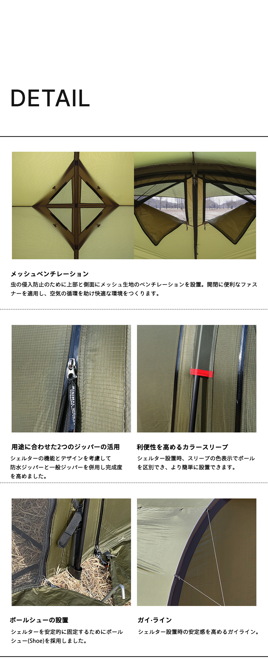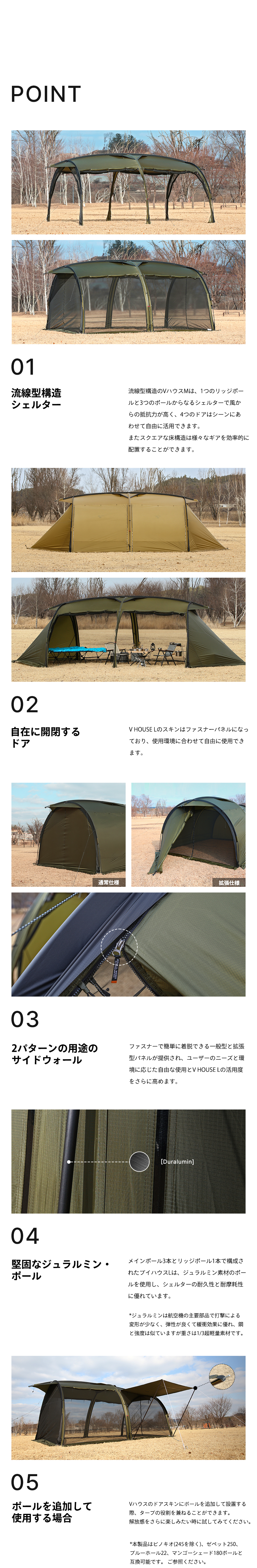 V HOUSE Lの正面と後面、側面は全て開閉でき、スキンとメッシュスキンの二重構造になっている為、シェルターだけでなく、メッシュスクリーン・タープスクリーン等、多様な形態に応用でき、1年を通して使用できます。