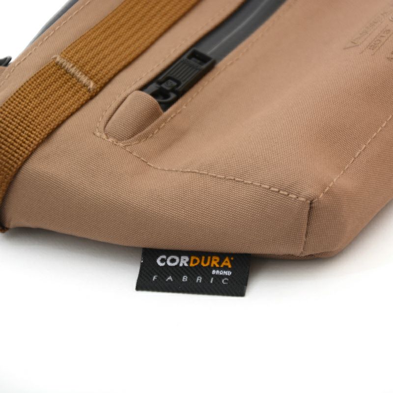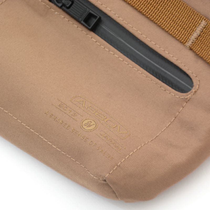 マテリアルには、AS2OVの中でも人気の高い「WATER PROOFシリーズ」で使用している自社開発の「UNBY-TEX」を採用しました。UNBY-TEXは特殊ポリエステル糸のCOURDURA®︎ 305D fabricをベースに、透湿防水フィルム L-VENTをラミネートした、「水蒸気を逃し、雨風は通さない」耐水圧20000mm以上というレインウェアの何百倍の防水性を兼ね備えたハイスペックマテリアルです。